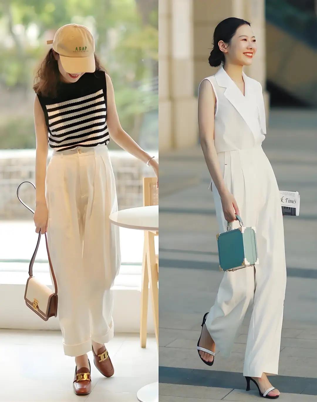 我们还可以选择针织衣服单品来搭配上西装裤,针织衣服有一个好处,那就是能让人看起来变得更加温柔,有女人味,例如下面这种浅蓝色和浅粉色的针织上衣搭配上灰色西装裤和白色西装裤,瞬间让人看起来显白显嫩又显年轻。