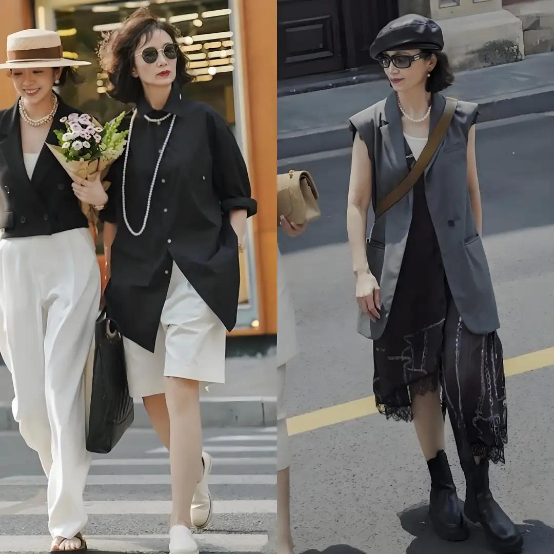 我们还可以选择最为基础的黑白灰衣服单品来搭配,例如黑色的衬衫搭配白色的百慕大短裤,脚上穿的白色的皮鞋,或者是用灰色的马甲外套内搭黑色的连衣裙,脚上穿了黑色的短靴,头上戴了一款黑色的贝雷帽,这样的穿衣打扮就算是五六十岁的女性穿搭都不容易出错,而且还很高级。