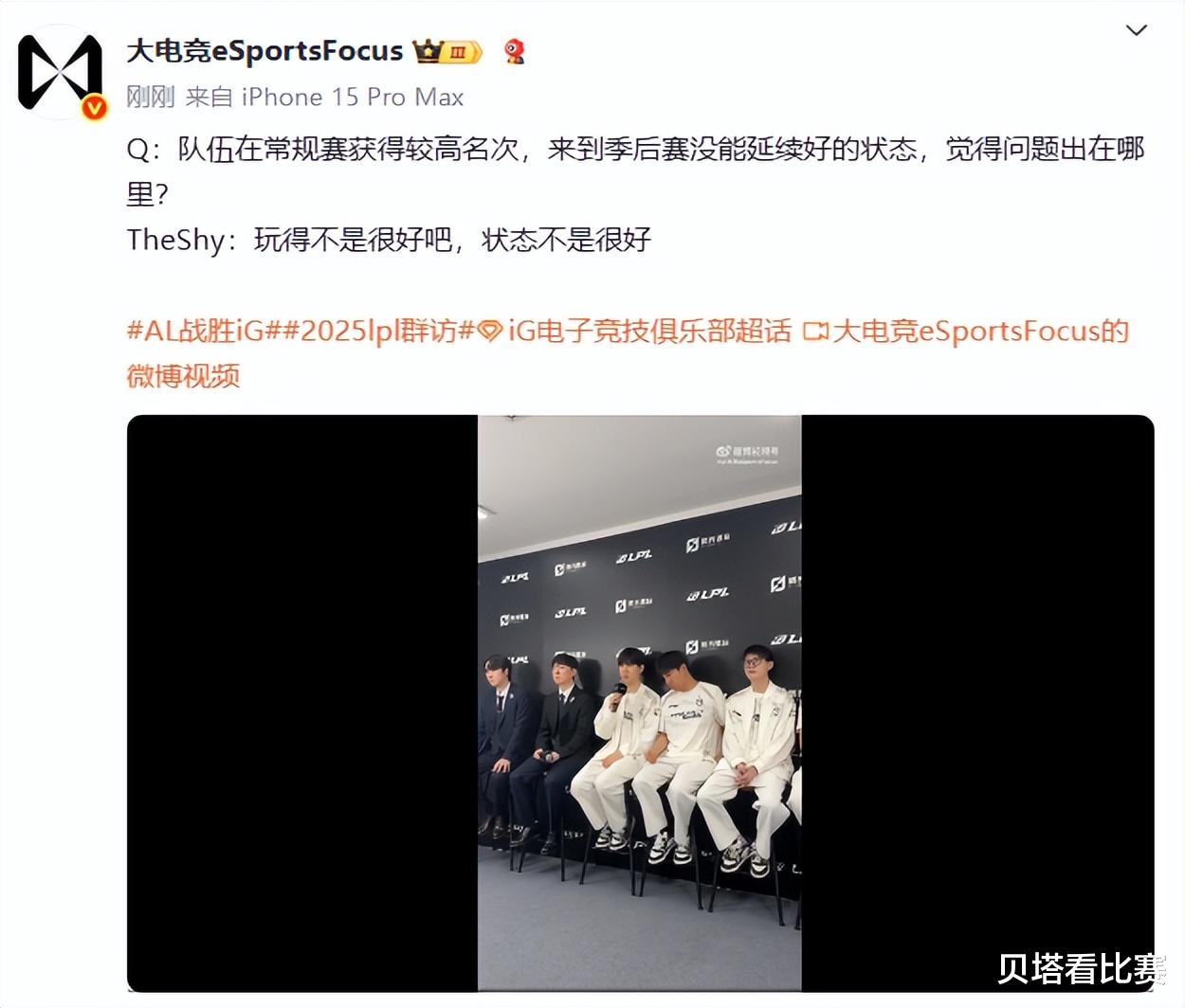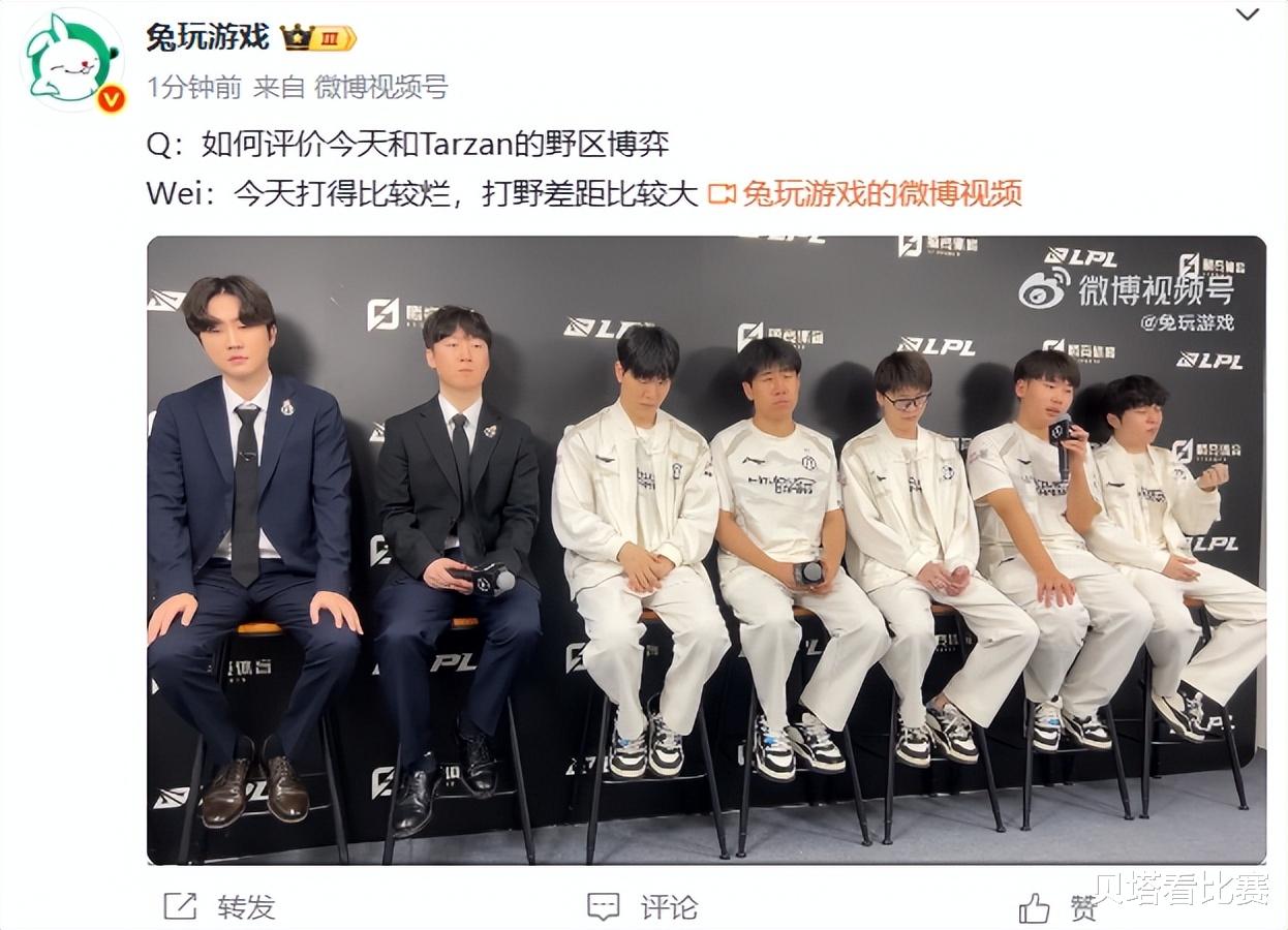 而在败者采访中,IG队员们感觉心态也有点崩了,比如说wei被问到这场和Tarzan的野区博弈,他承认:自己打得比较烂,这场打野差距比较大。