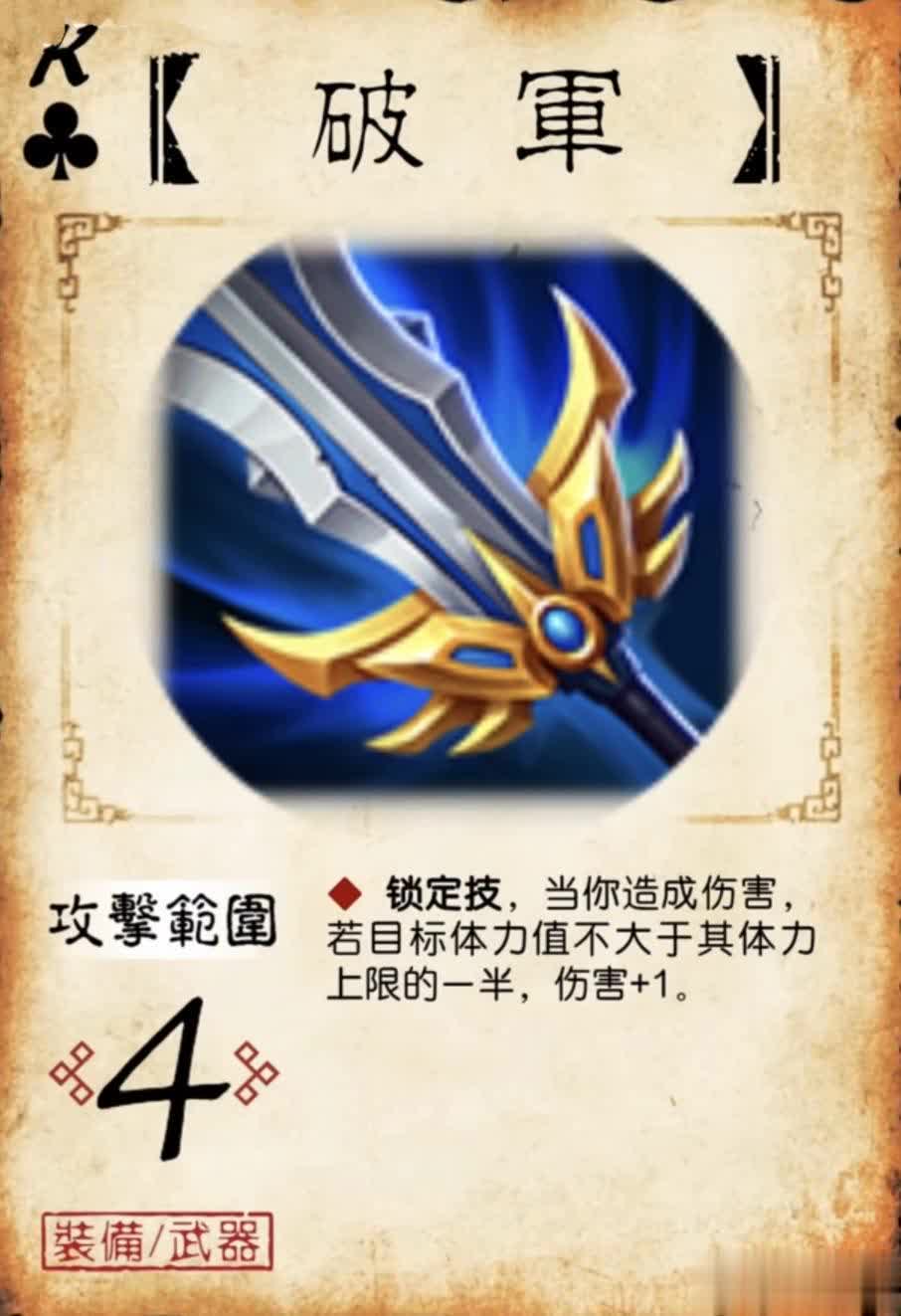 破军的特点是对半血以下的敌人加伤,三国杀的设计则是对方半血状态就能提升伤害。虽然强度可能不高于无尽战刃,但加伤效果很稳定,而且攻击距离是最远的,也不算低人一等!