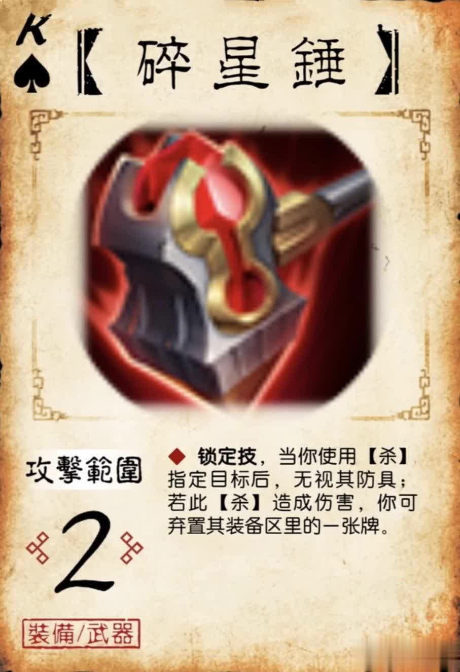 碎星锤的特点是穿透属性,对标三国杀里类似青釭剑,因此穿透防具是必须具备的能力。碎星锤还获得了弃置对方装备的效果,毕竟大家效果都那么强,碎星锤也不能落下吧!