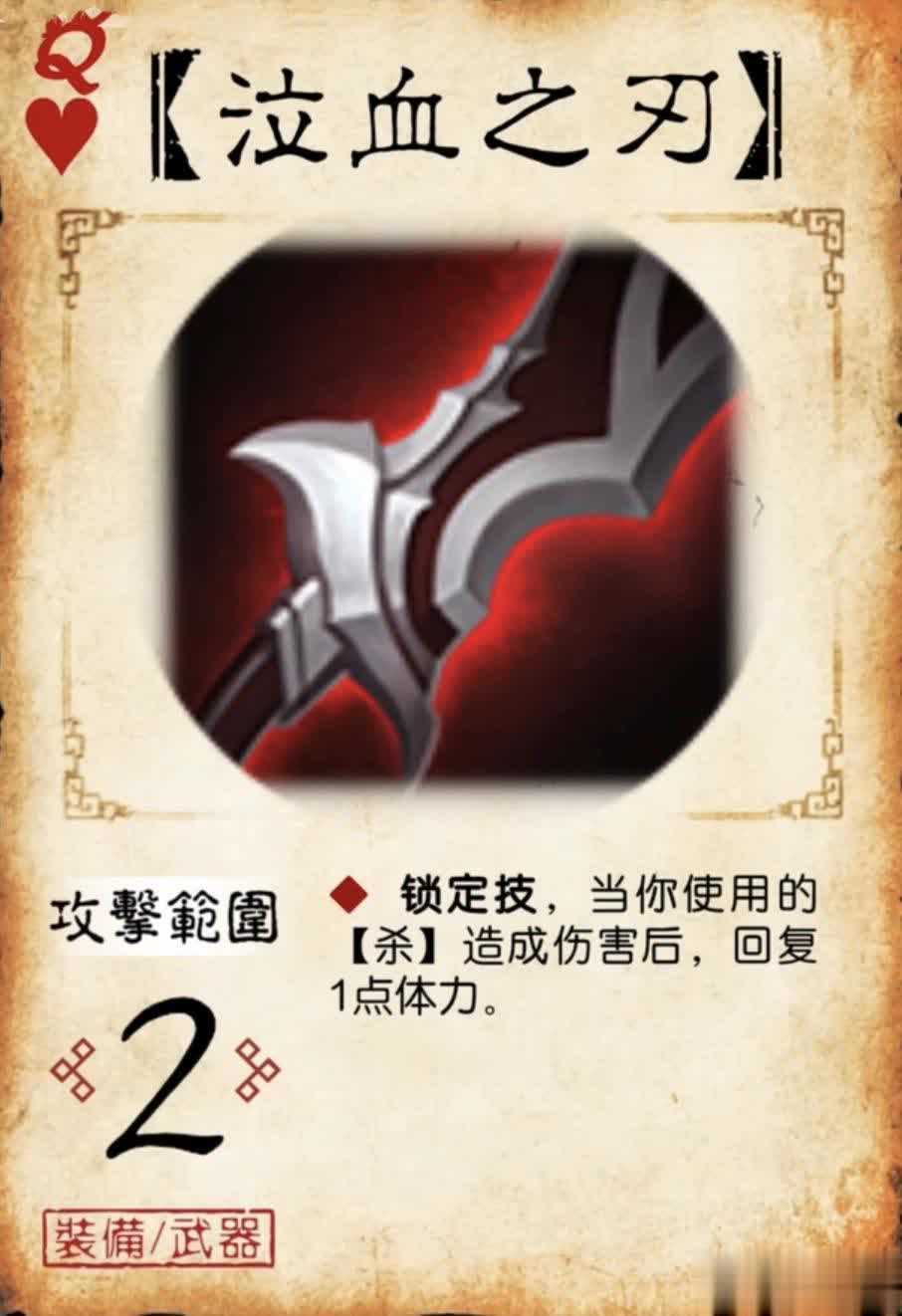 泣血之刃的特点是造成伤害后恢复生命值,三国杀装备的效果与之相同,都是造成伤害后就能回血。但为了限制强度,防止变成吸血鬼,因此只有杀可以回复……
