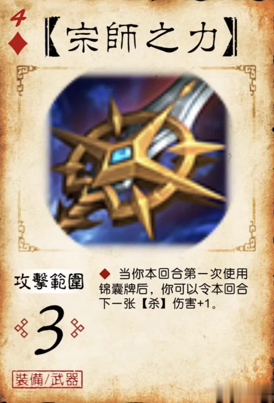 宗师之力的特点是使用技能后,下一次造成的伤害会增加。三国杀装备则是将锦囊替换为技能,下一张杀会增强,但没有强命,大大提升了强度,但是也不至于太过超标。