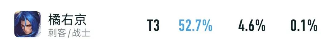 以上是他目前的巅峰赛数据,虽然出场率不怎么高,但胜率却能徘徊在53%左右,国服分也成功挤进打野榜的前十,说明越是高分段,橘右京的强度就越高。