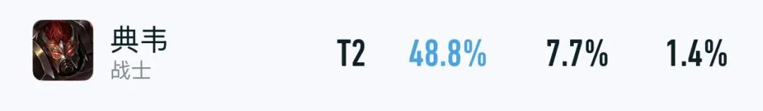 也正因如此,典韦的巅峰赛优先级才会暴跌很多,仅剩48.8%胜率+7.7%出场率了,排在打野榜的中下游,说明前期伤害不太稳定确实是硬伤。