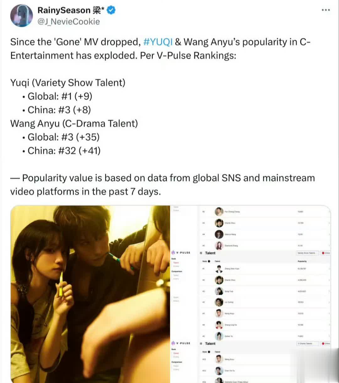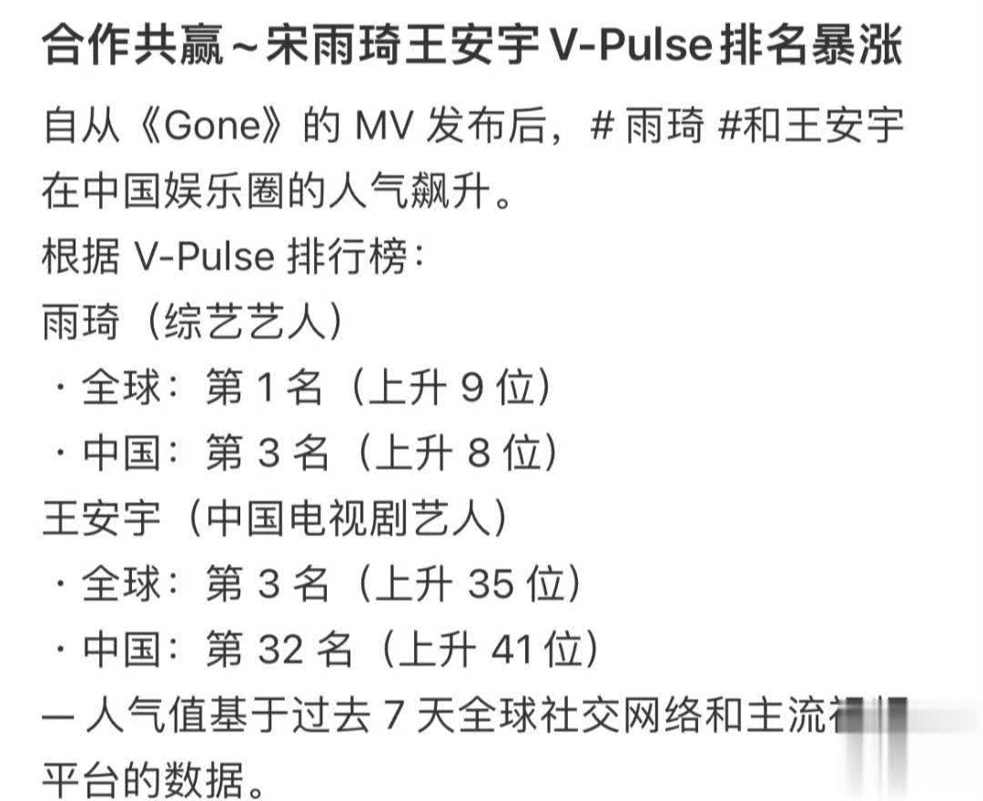 “爆了”——4月18日零点的微博热搜,被宋雨琦、王安宇双双霸榜。V-Pulse官方账号发布最新一期全球艺人热度榜:宋雨琦空降总榜第一,较上期飙升9位;王安宇更夸张,一口气蹿升35位,直接杀进全球前三。所有讨论都指向同一个导火索——两人合作的剧情版MV《Gone》上线仅48小时,播放量冲破4000万,B站弹幕密度高达每秒400条,抖音相关二创投稿量24小时破10万。流量像被打开的消防栓,喷涌得肉眼可见。