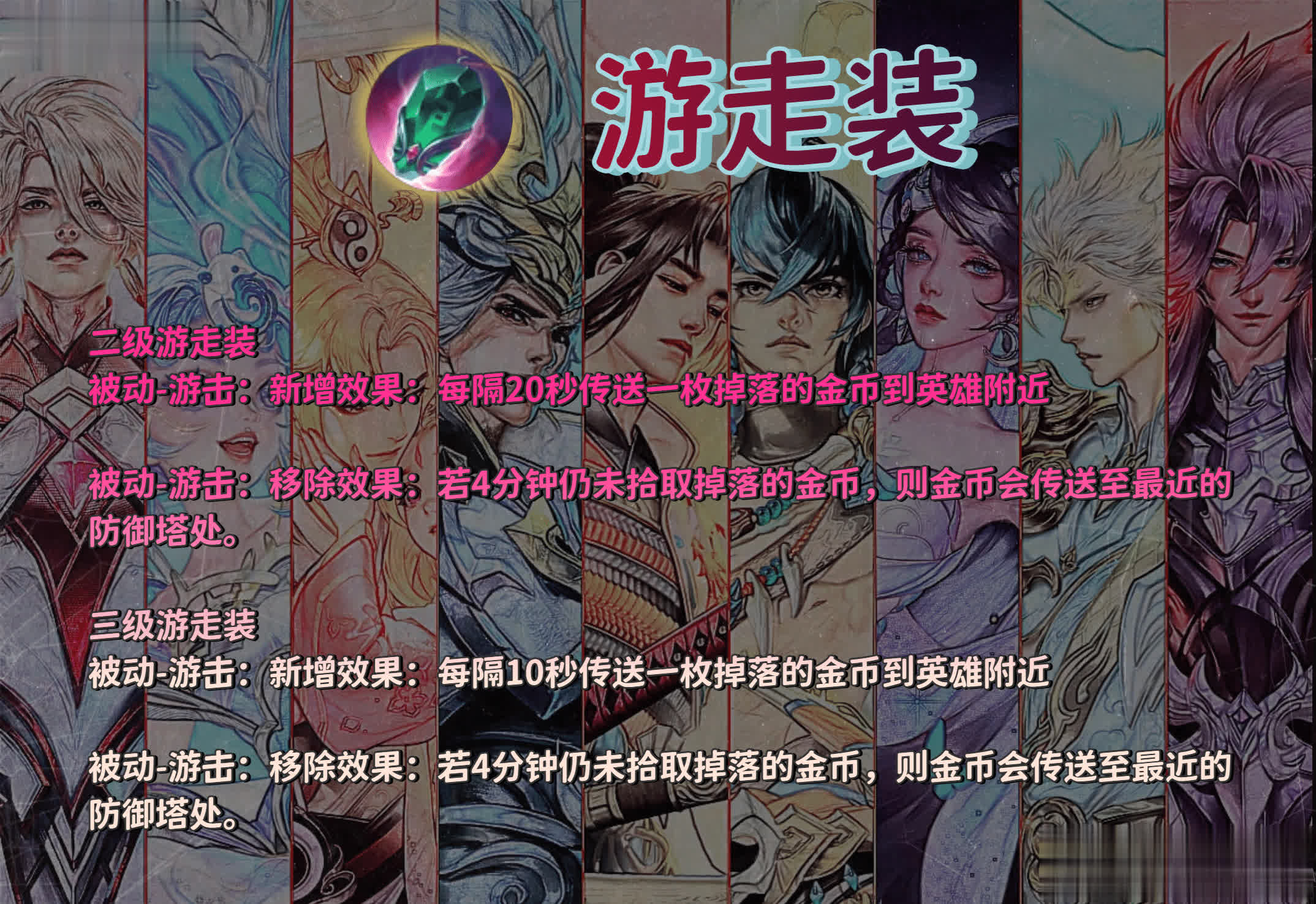 二三级的游走装,移除了四分钟未拾取掉落的金币,会传送到最近防御塔的机制,新增了每20/10秒传送一枚金币到自己身边的机制。