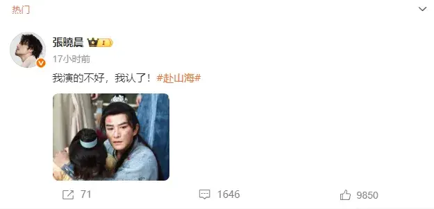 近日,由@成毅 、古力娜扎@我是娜扎 等主演的古装武侠剧《赴山海》因画面穿帮、台词等问题引发争议。《赴山海》演员@張曉晨 发文:“我演得不好,我认了!