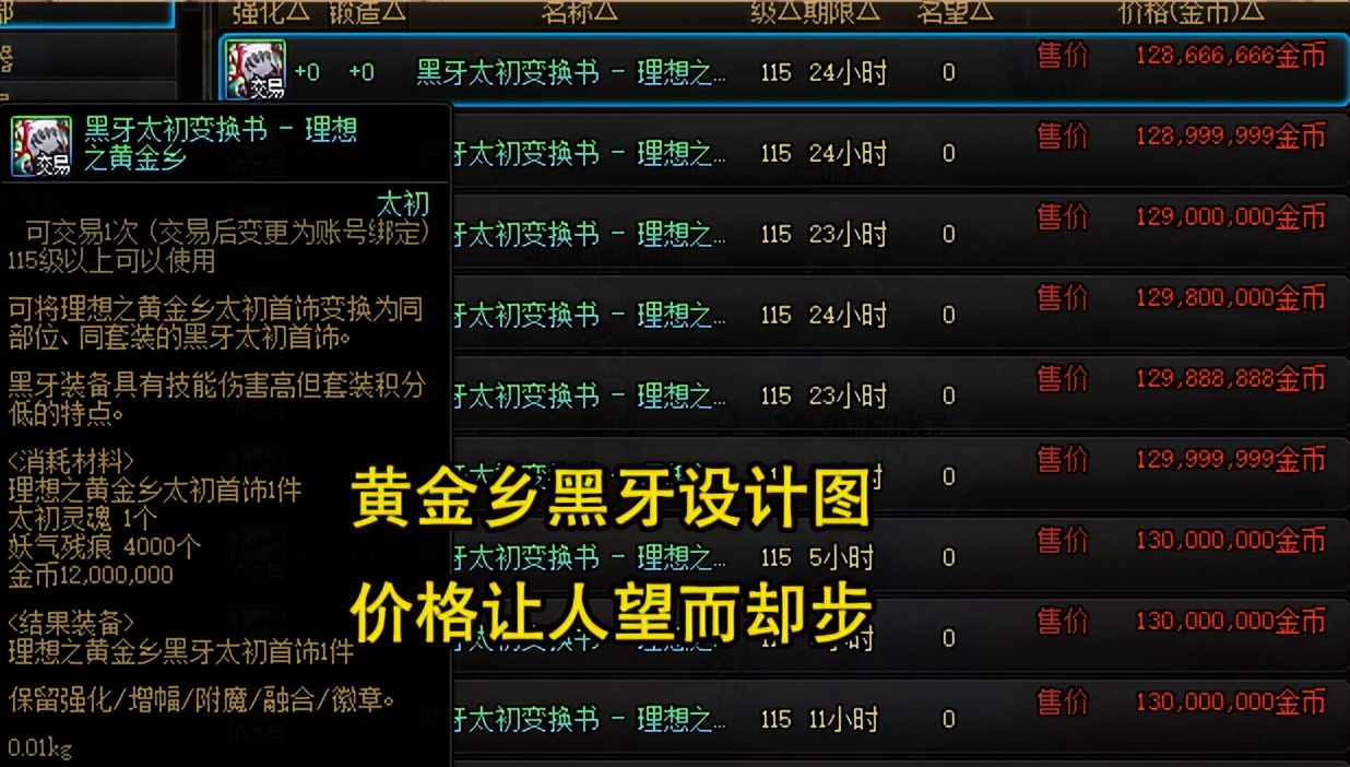 在国庆版本上线之前,1件黄金乡黑牙太初设计图为9000万;国庆版本上线后涨到了1.65亿,虽说目前已经降到了1.3亿金币,但依然让人望而却步。