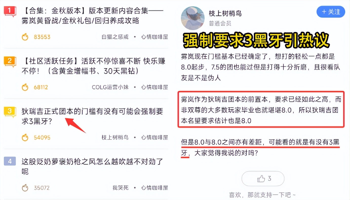 一个8人前置本要求就已经如此之高,也让玩家对明年1月份推出的狄瑞吉团本门槛展开了无限遐想。有玩家结合目前狄瑞妮8人本的门槛,提出了狄瑞妮会强制要求3件黑牙预测,一时间登上了热搜,并引发了热议。