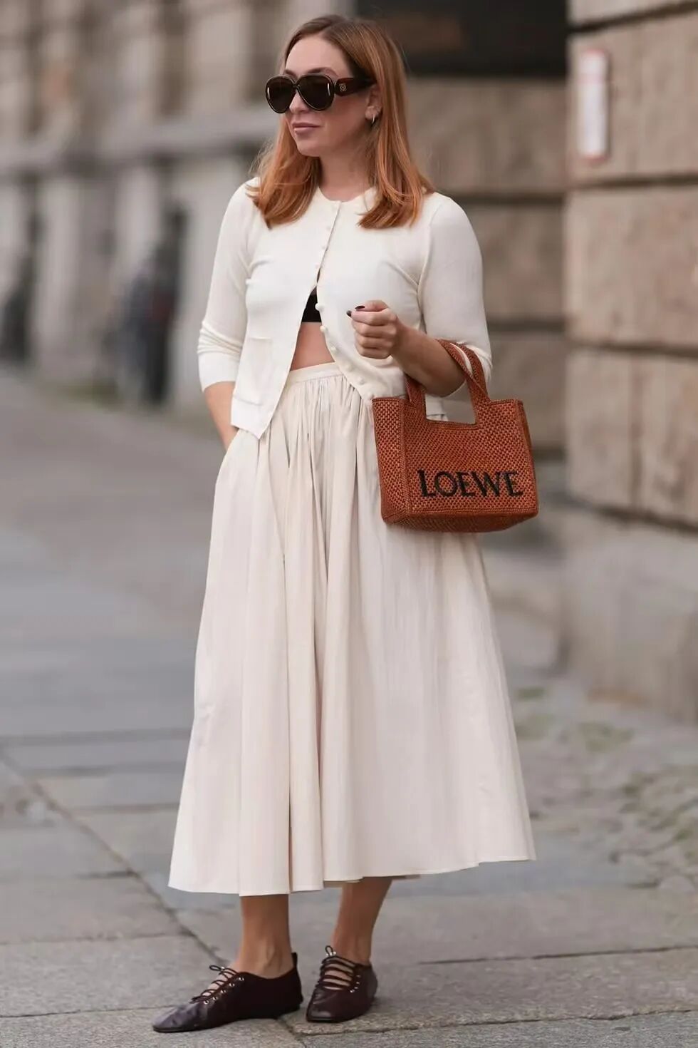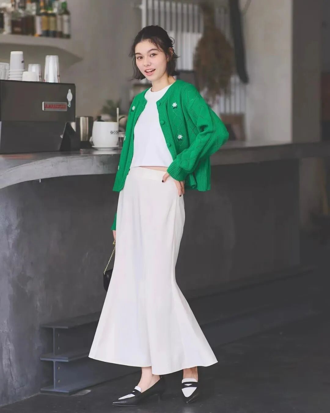 白色系的也不错,选择带点暖意的米白色针织小开衫搭配同色系的半身长裙,简单又时髦。针织衫只扣最上面的几颗扣子,下摆形成一个倒V字,可以显瘦,同时还能让视线重心上移,有显高的效果。