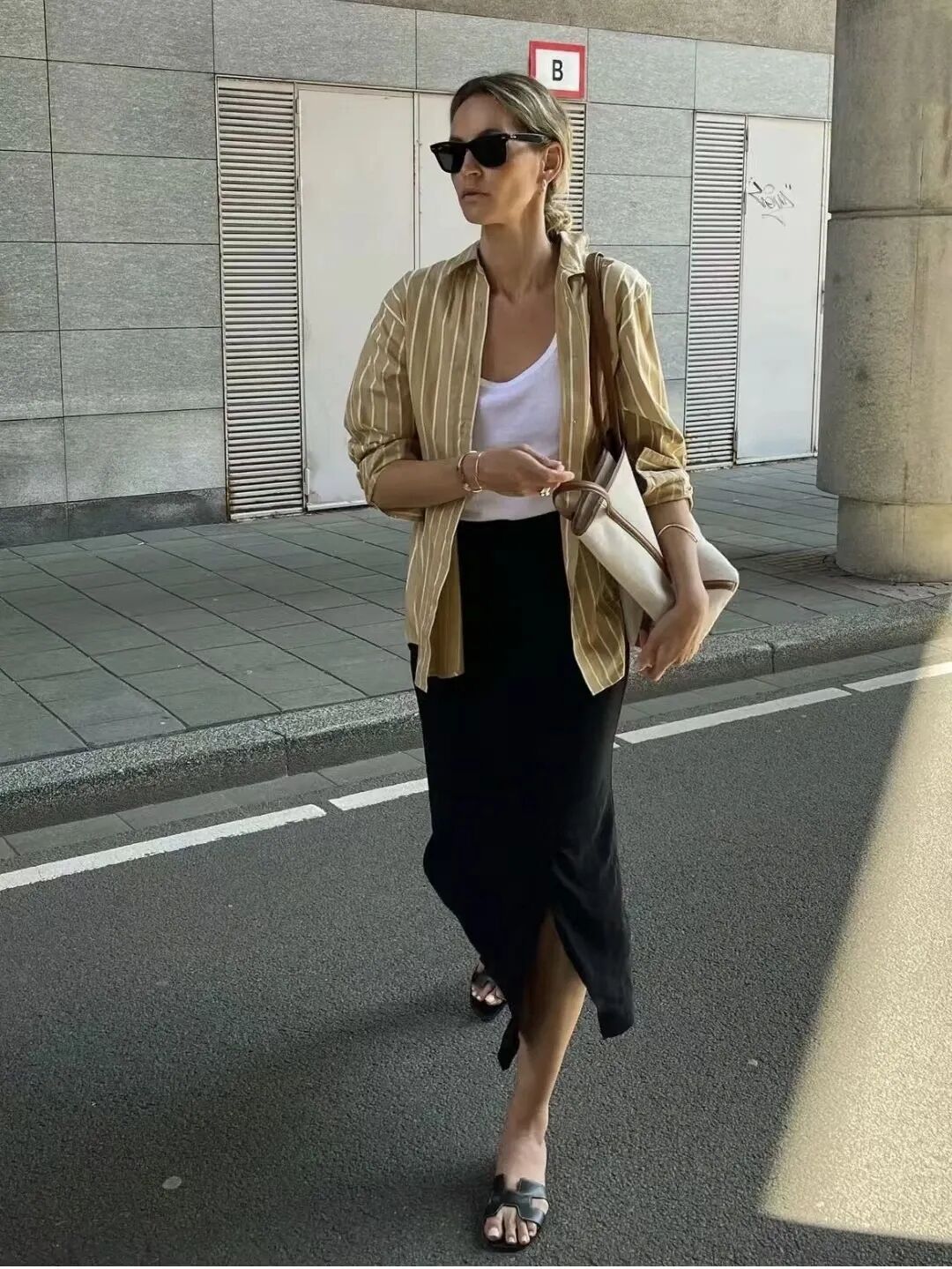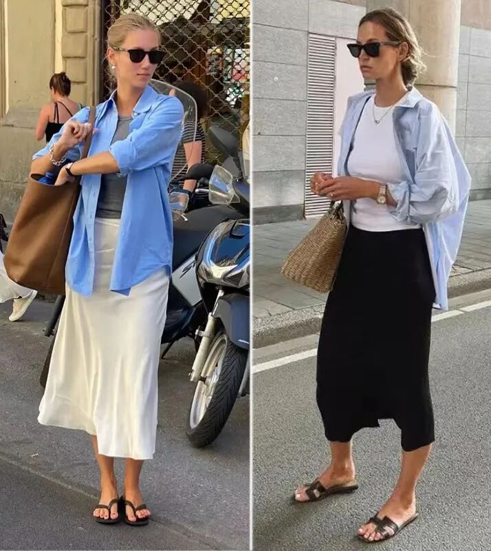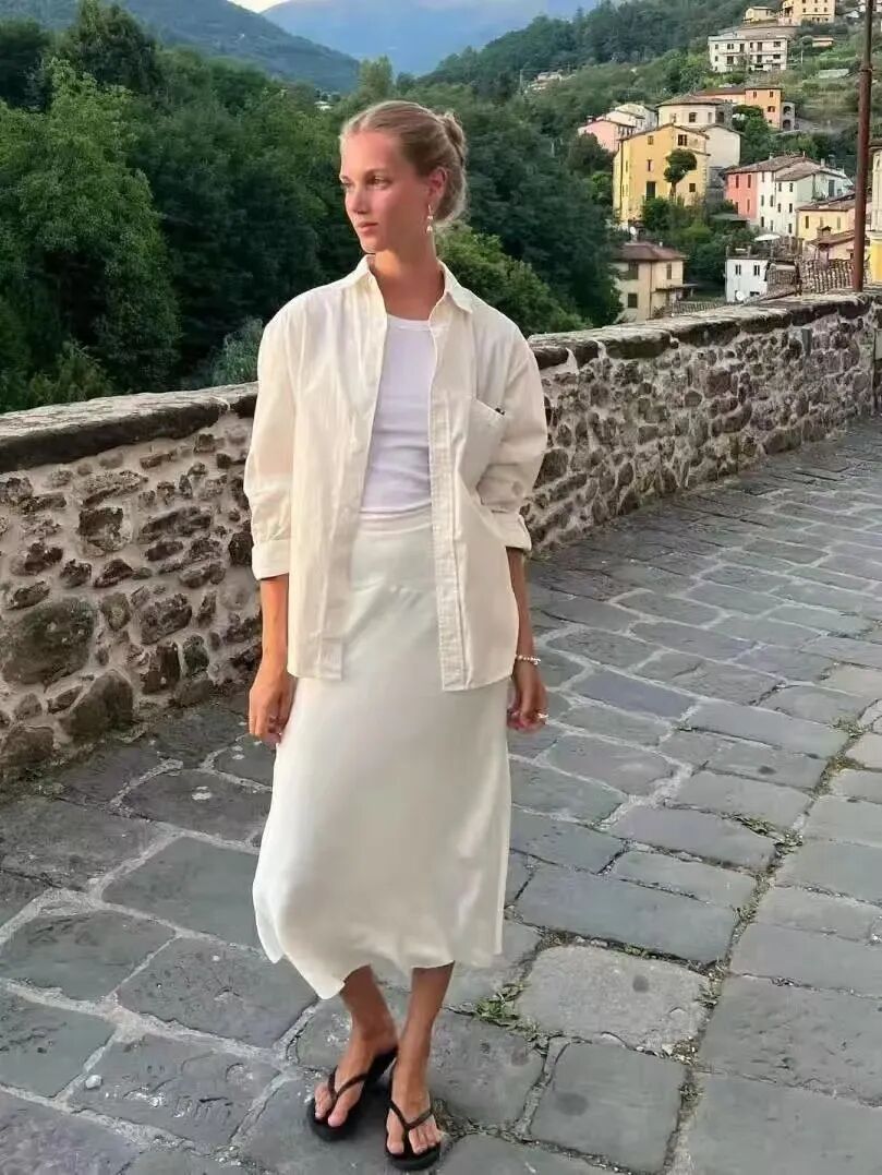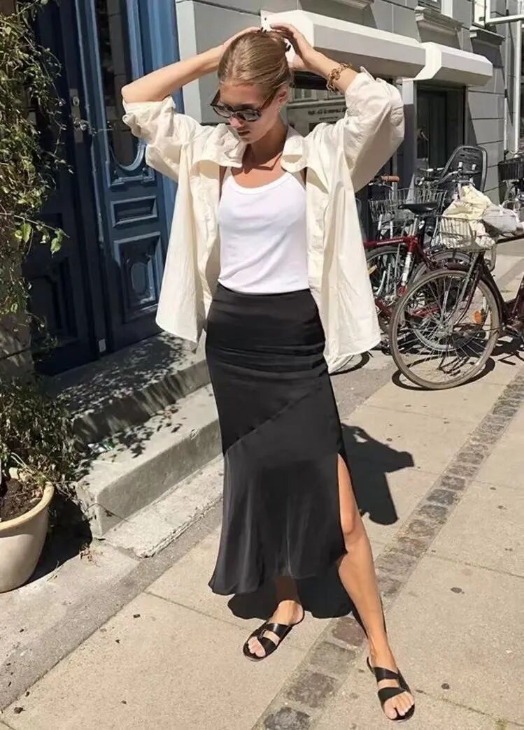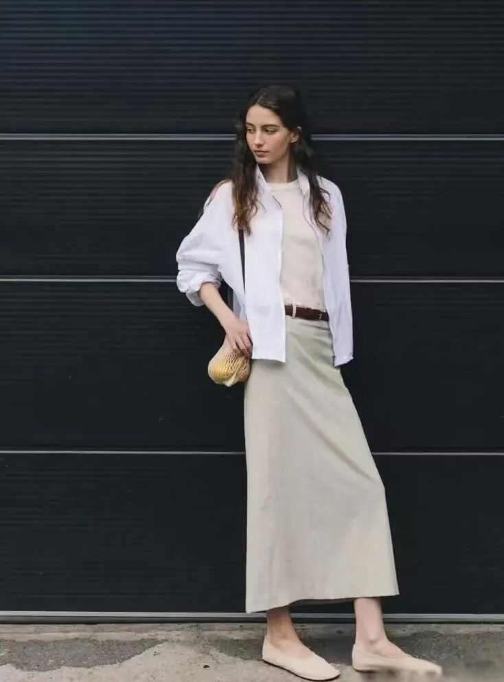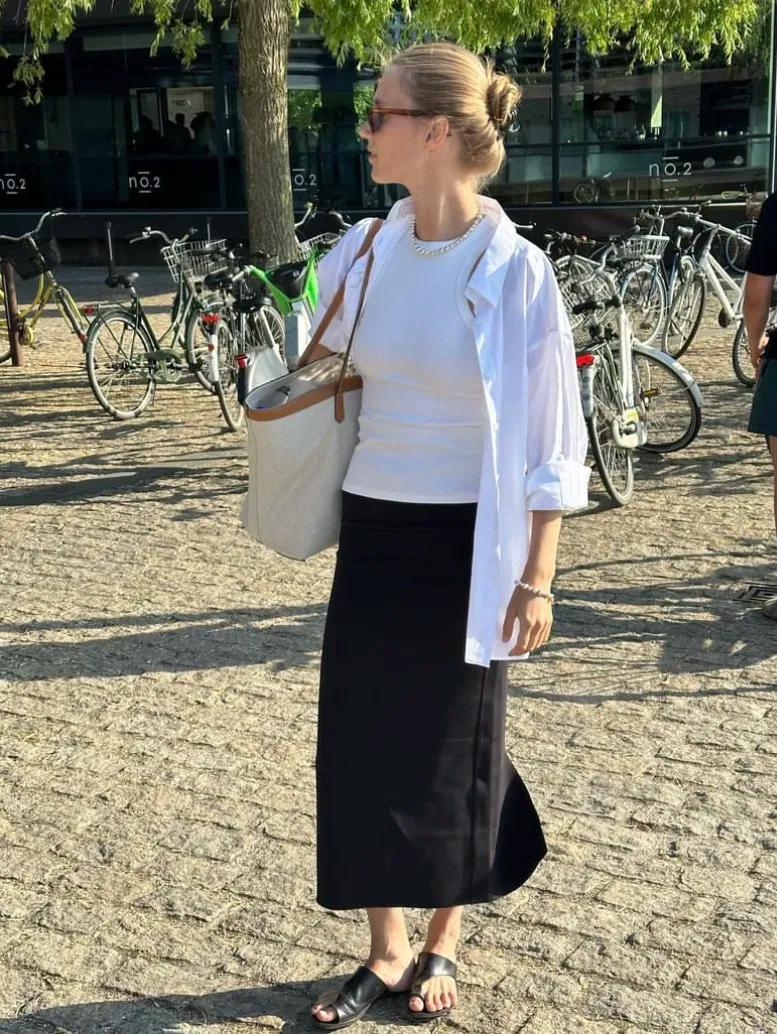 比如,白衬衫化作薄外套,内搭白色的小背心,就能穿出简约的层次感。下装搭配优雅利落的黑色直筒半裙,优雅又不失随性,时髦感随之而来。