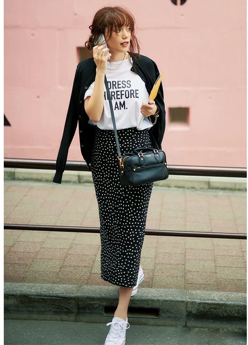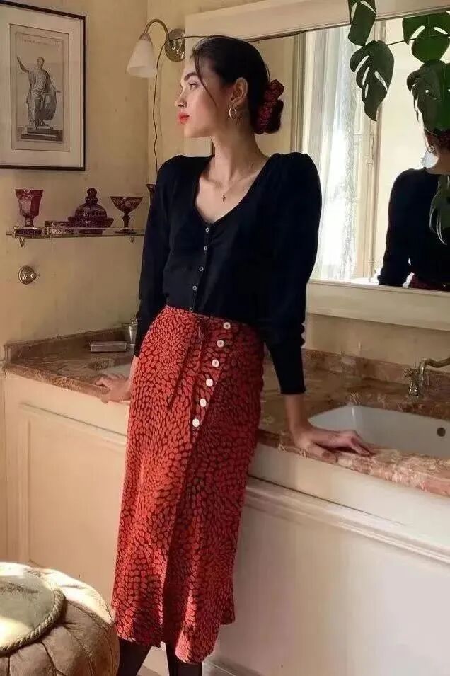 如果更偏爱穿黑白灰,那就遵循自己内心的喜好,黑色针织小开衫永远经典又高级。裙子可以选择特别一点的款式,直筒的波点裙或者红色的印花裙都很有品,搭配黑色小开衫优雅灵动,还很有复古气息。