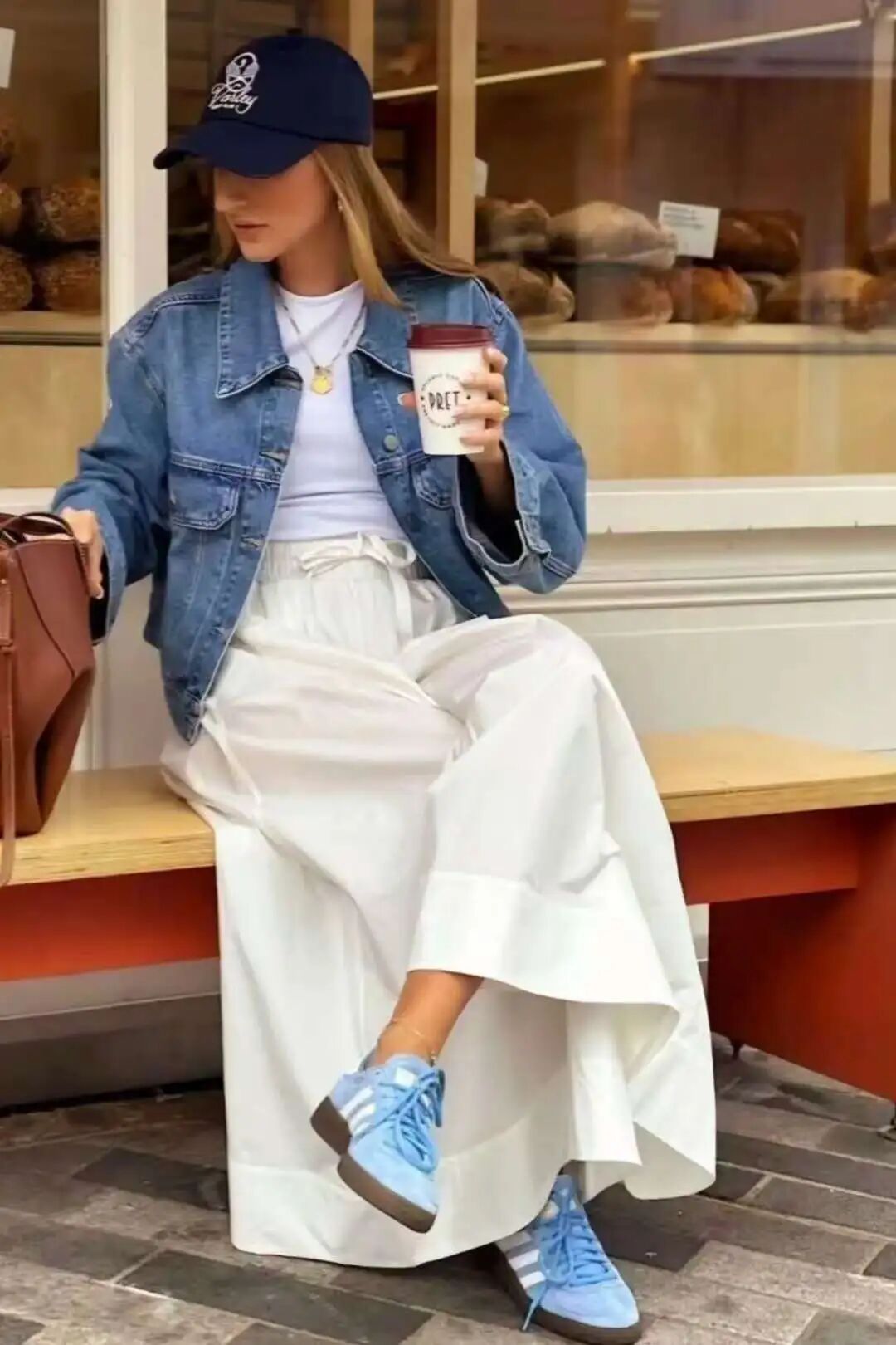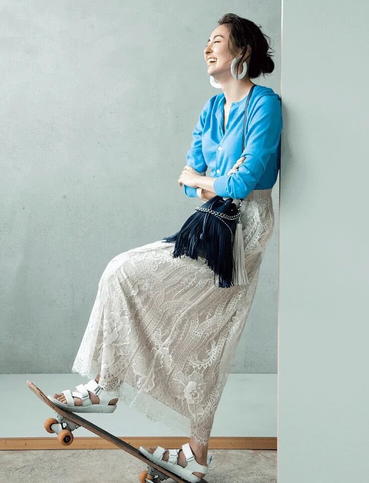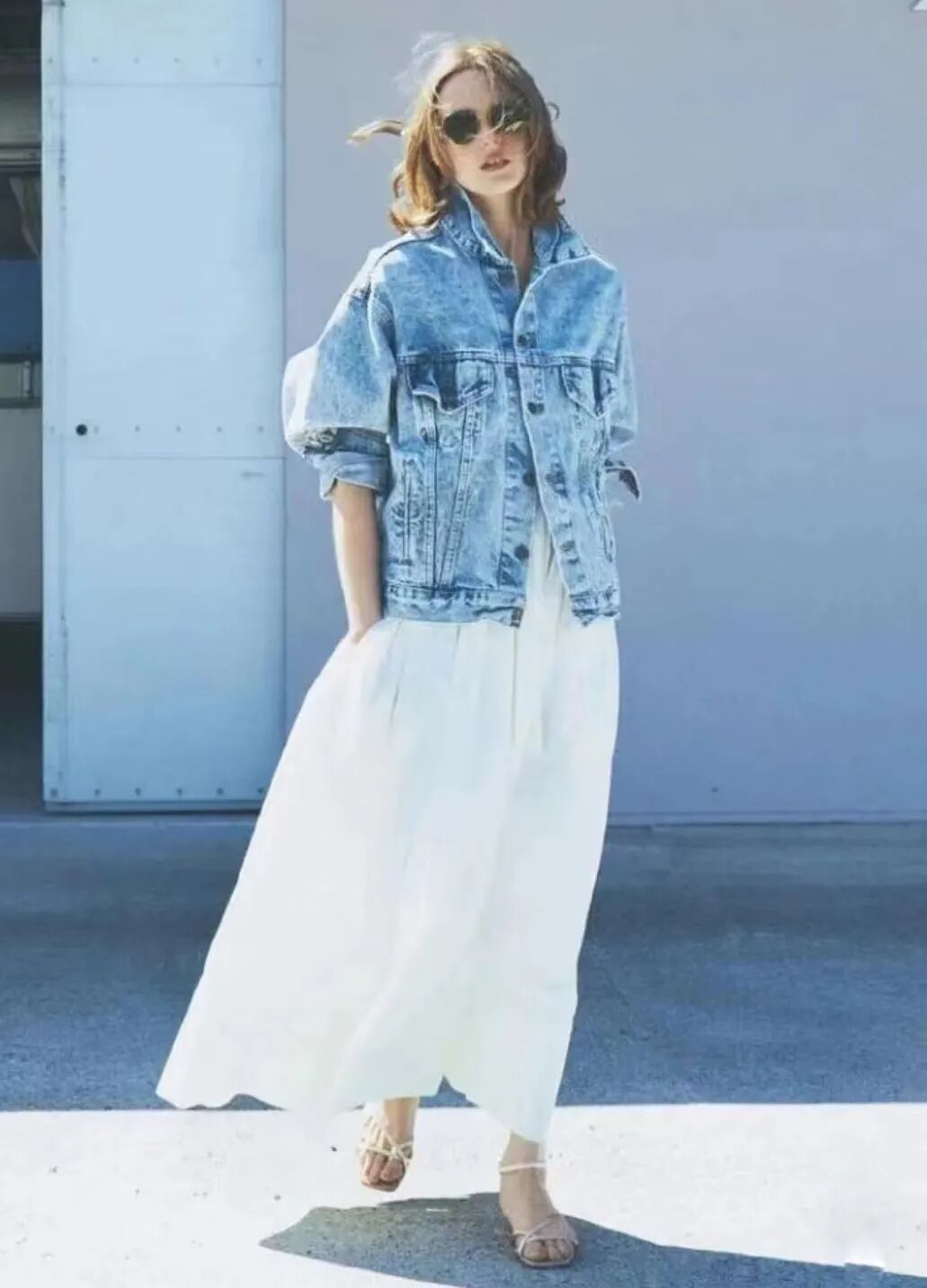 牛仔外套搭配白色长裙,蓝白配色清新扑面,白裙子仙气飘飘,像轻柔的云朵,减弱了牛仔外套的硬朗,在中性风之中融入了温柔女人味,轻松穿出别样的时髦。