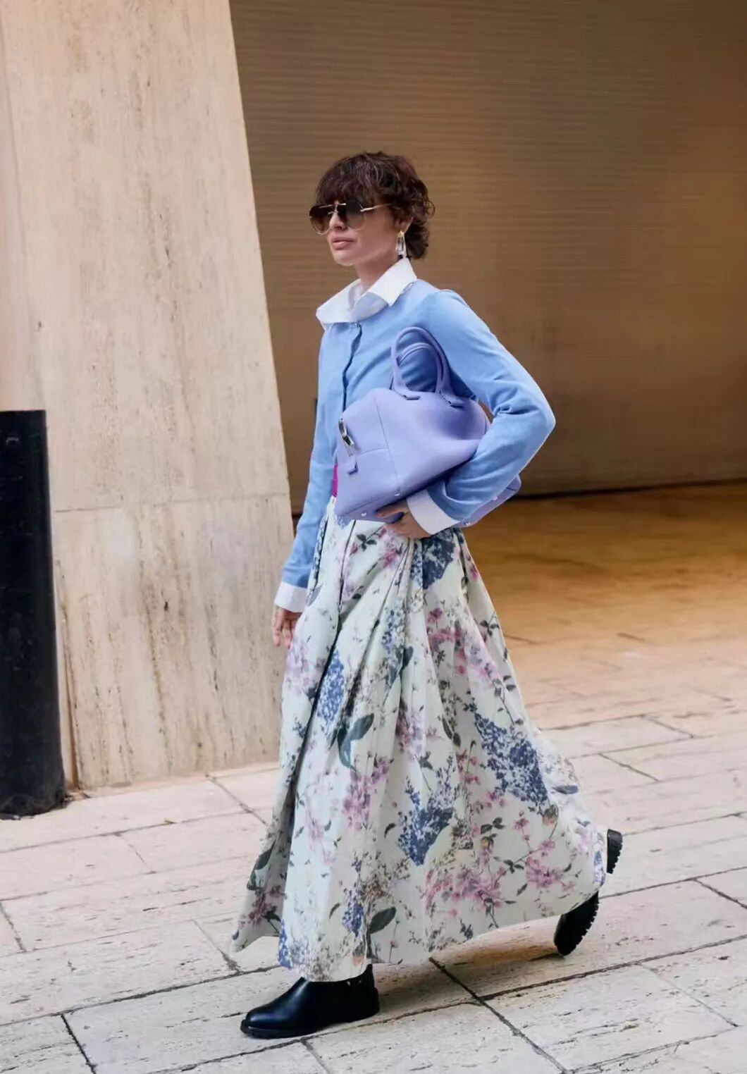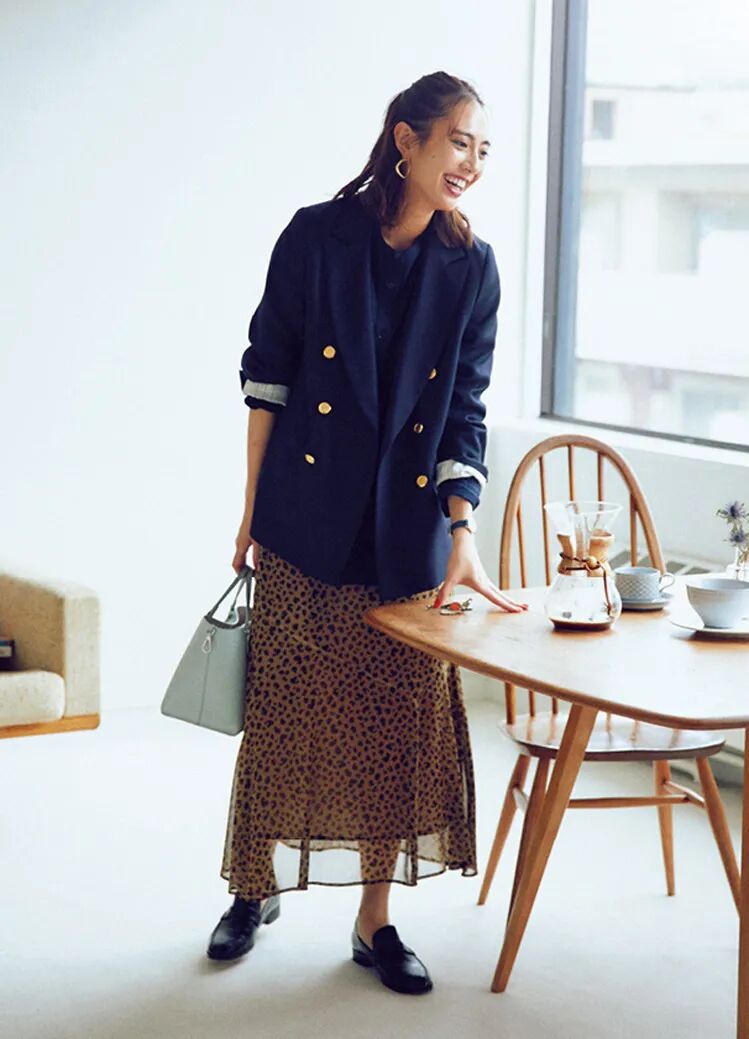 西装外套搭配裙子,是一种帅美双全的风情。不过,秋天还不适合穿得太厚,保持轻盈感,仍然是日常穿搭的主题。