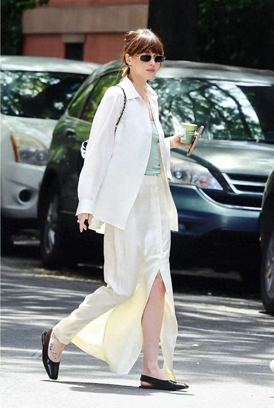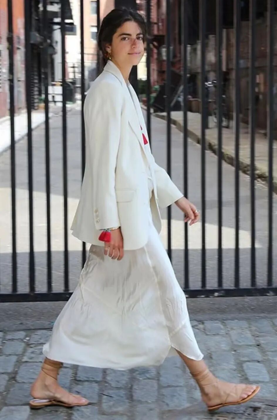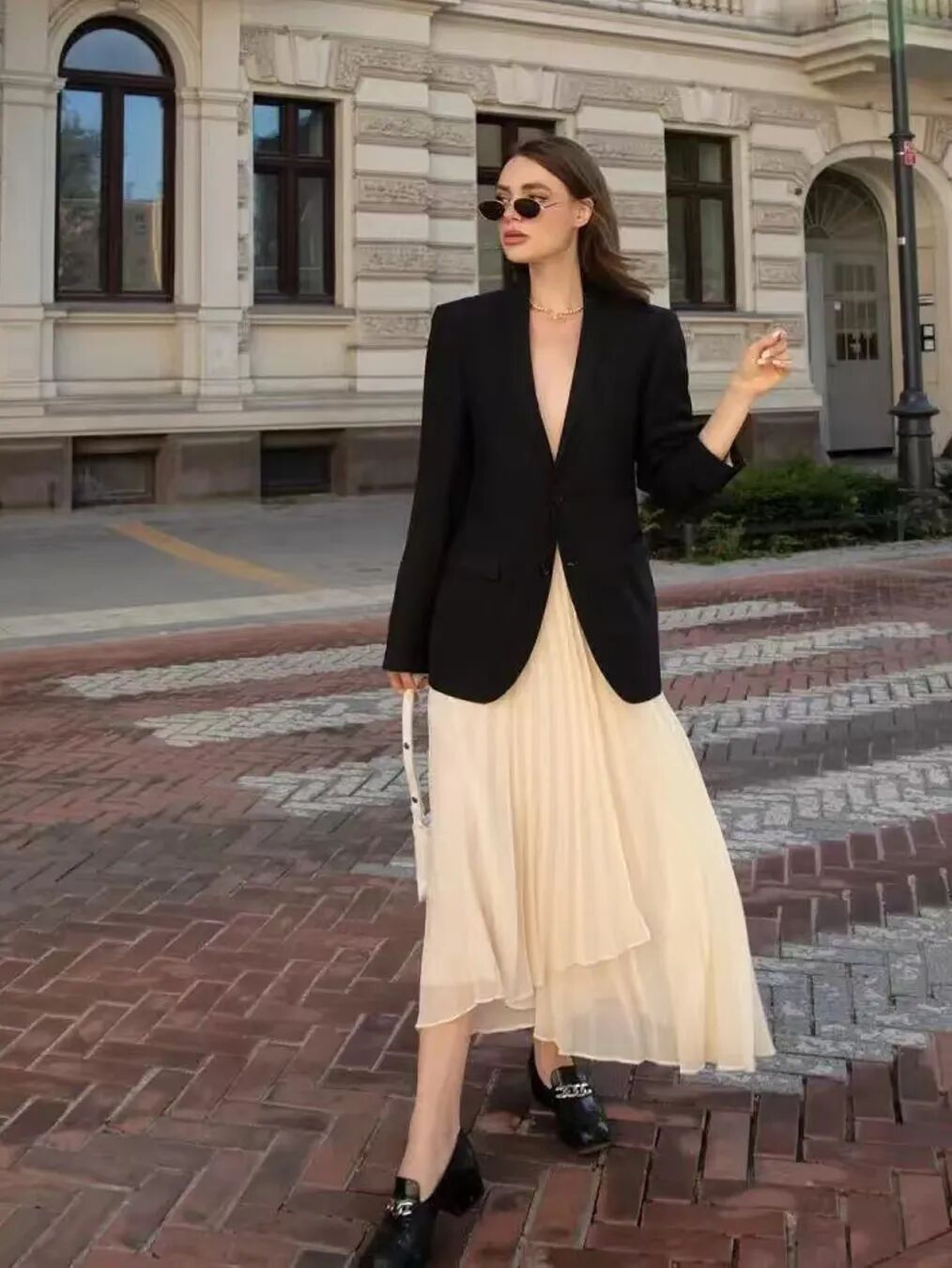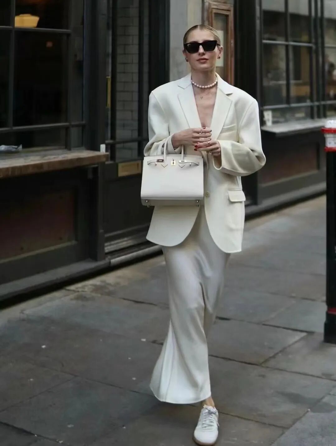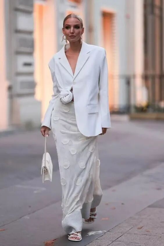 色彩搭配方面,白色系的西装更容易穿出轻盈感,比深色系的西装更适合秋天,搭配一条同色系的缎面长裙,一身白,高级感也悄然而生。