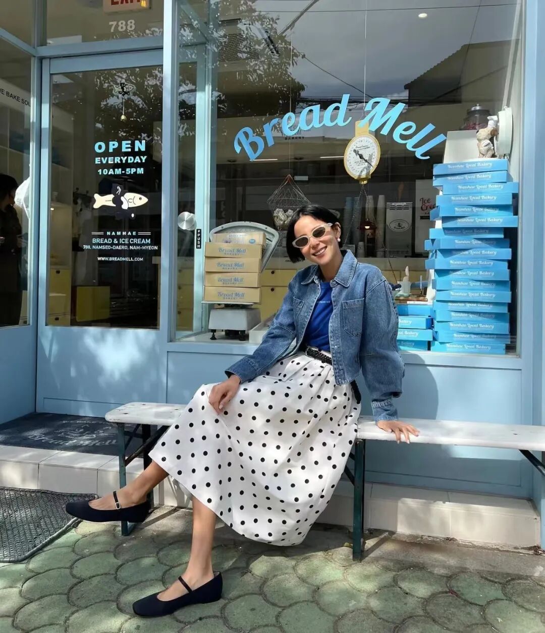 短款的牛仔外套更适合小个子女生,可以提高腰线,下装搭配白色的波点半裙,优雅灵动,复古又时髦。