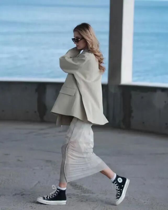 所以如果秋天用裙子搭配西装外套,更建议选择那些材质轻薄的半裙。比如薄纱、丝缎或者醋酸面料的裙子,质地柔软轻薄,可以弱化西装的硬朗,为造型增加柔美感与女人味,和西装一起打造刚柔并济的美。
