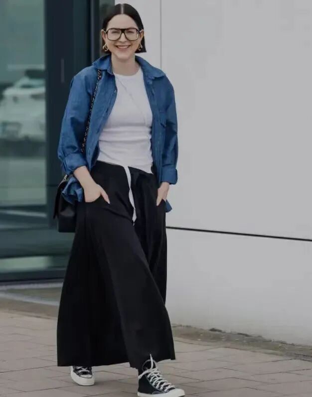 或者试试牛仔衬衫,也是秋天的经典款,作为薄外套来穿既帅气又带点少年感,和黑色长裙配在一起特别美。