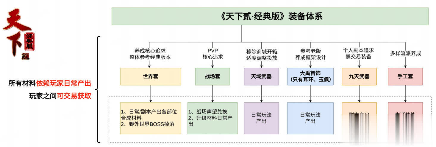 再看《天下贰·经典版》,在还原氛围与体验的同时,也放慢了整体的游戏节奏,其中包括各类养成投放、副本玩法开放的调整。至于备受大家关注的装备系统,也仅保留了世界套、战场套、天域大禹、九天武器等具有情怀价值的装备体系。