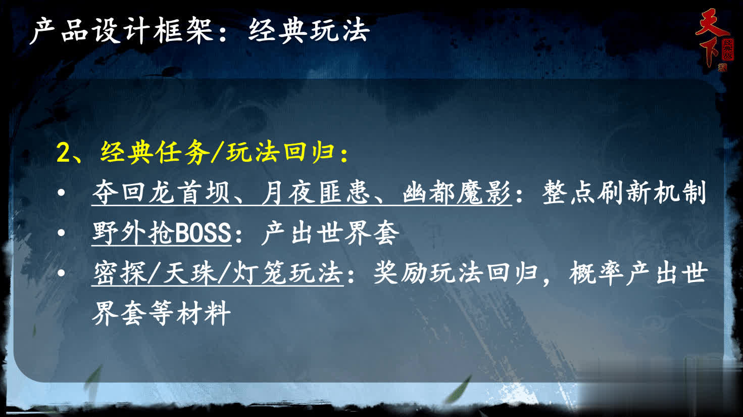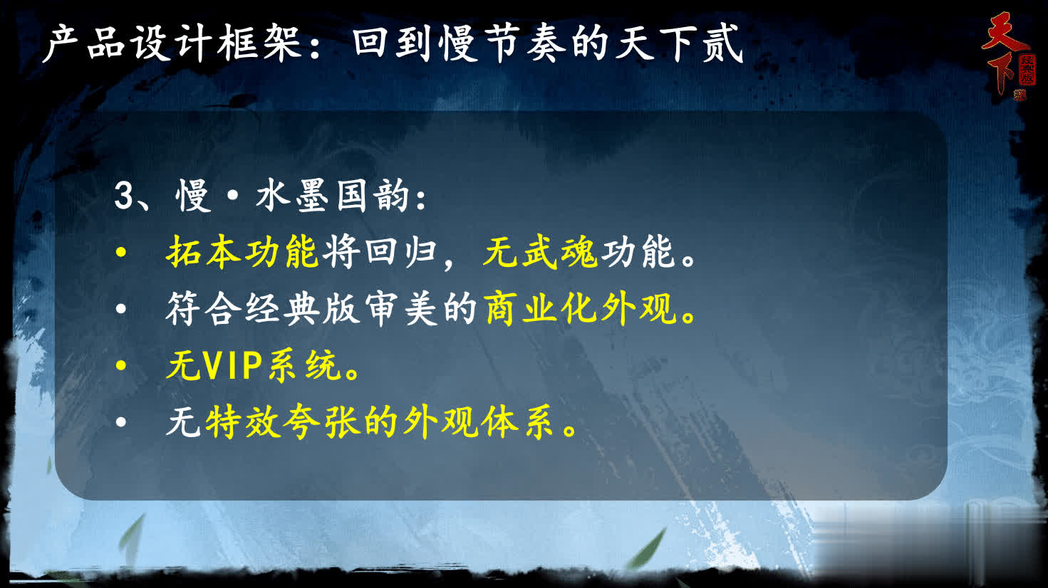 就在9月25日,《天下贰·经典版》在玩家投资人群内开启首场直播,策划尘尘详细介绍了游戏的产品设计框架和思路,包含装备体系、明确的养成节奏、付费模式等等。据尘尘透露,《天下贰·经典版》基于08-11年《天下贰》版本为基底设计,所有《天下3》的设定均不会出现。谈到游戏的养成节奏,尘尘指出,整体预期规划为三个月内达到70级,半年以上可升至75级满级。