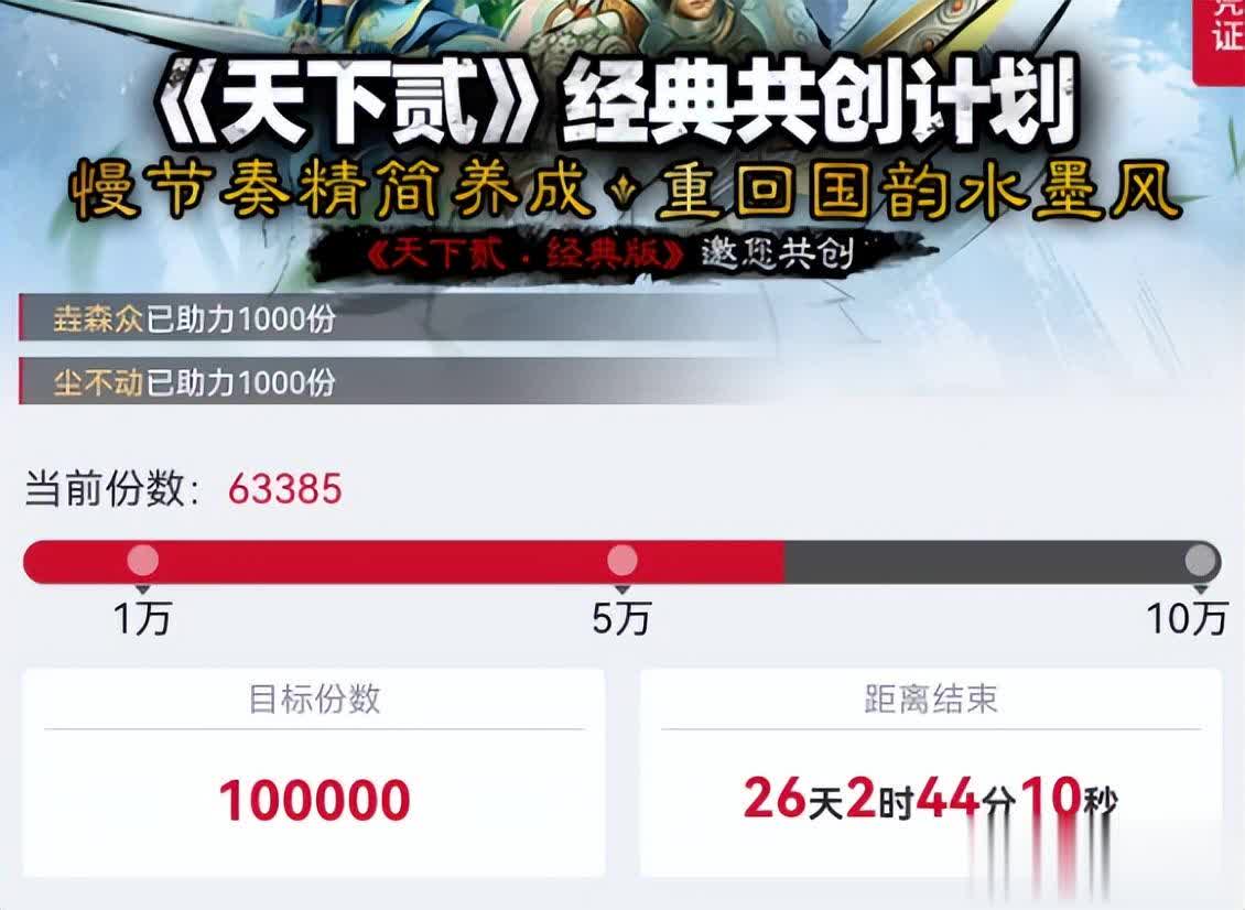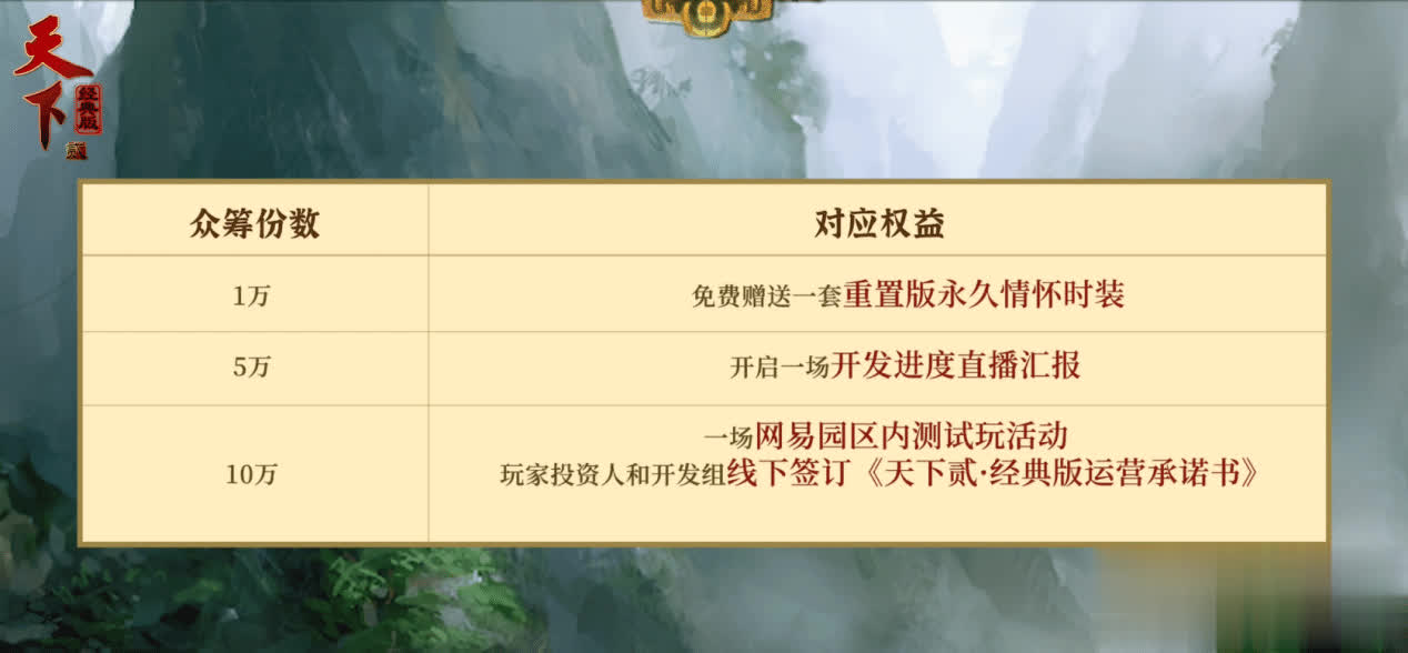 可以说,本次直播是展现项目组诚意、深化开发组与玩家内容协作的生动缩影。群内不少玩家从一开始的不信任,也变得逐渐认可,纷纷表示支持这种立竿见影的互动。因此,在本场直播结束不到两小时之际,《天下贰·经典版》众筹份额就从7.7W突破到10万,提前23天完成了官方设定的目标。