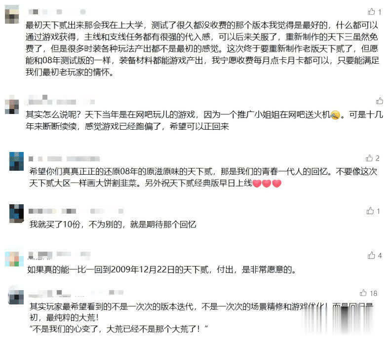 “我就买了10份,不为别的,就是期待那个回忆。”一位玩家如此说道。如今在《天下贰·经典版》相关文章的评论上,随处可见的都是老玩家们对大荒的思念之情。《天下贰·经典版》的出现,可谓是唤起了老玩家们对自己青春的追忆,同时也给这些老玩家提供了一个重聚的契机,让他们重新回到2008年那个充满国韵水墨风的江湖。