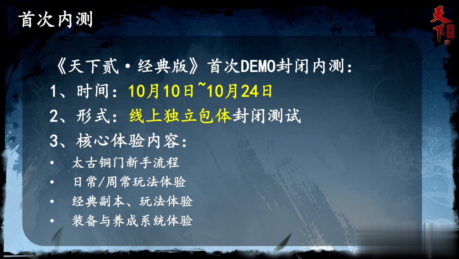 不过这个明天并不遥远,官方现已公布《天下贰·经典版》首次DEMO封闭内测将于10月10日至10月24日开启。届时,玩家们将有机会亲身体验太古铜门的新手流程、丰富多样的日常玩法、经典副本、装备与养成系统等内容。