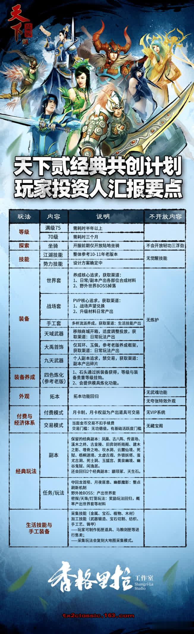 总体而言,《天下贰·经典版》是一次大胆且创意十足的尝试,它不仅打破了传统MMOPRG游戏的常规节奏,还拉近了传统游戏开发者与玩家之间的距离,让玩家能够以投资人的身份深度参与到游戏的决策过程中。这种模式不仅增强了玩家的归属感和参与感,也能让开发组直接听到玩家的声音,从而对游戏进行针对性的优化和改进。