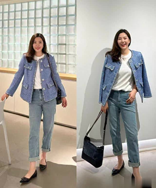 小香外套可以通过与下装的匹配,降低它的驾驭难度,但在选择时也需要有确切的筛选范围,才能避免踩雷。蓝色外套就是很值得采用的款式,设计简约、拒绝流苏之类的装饰,腰身呈直筒版型,增添更利落帅气的感觉,才能有效避免穿出精致的土气感。