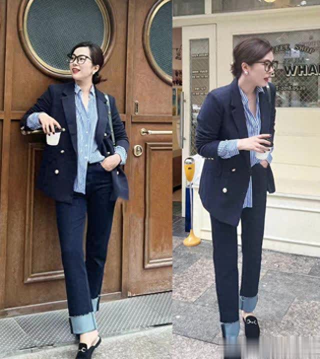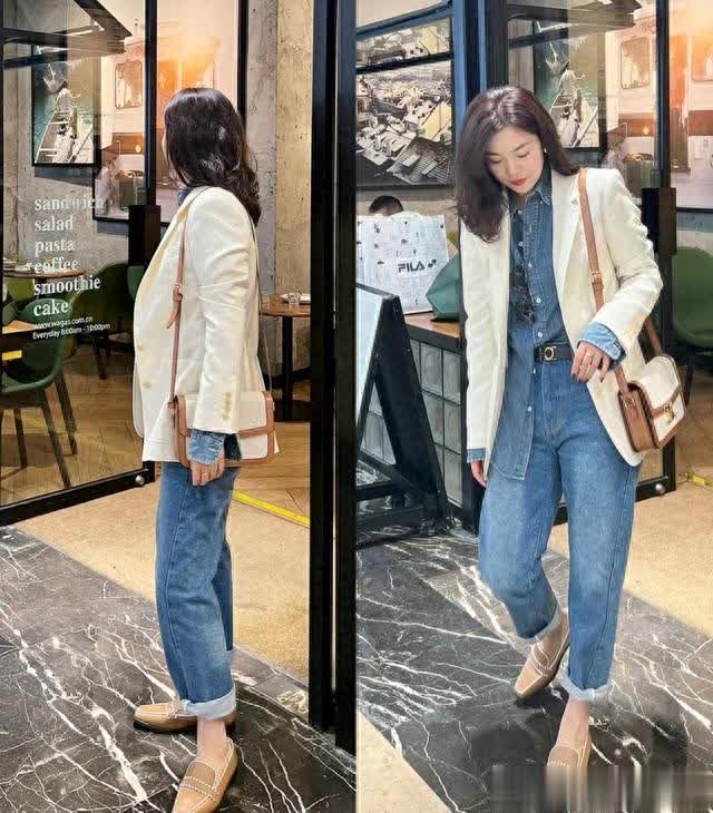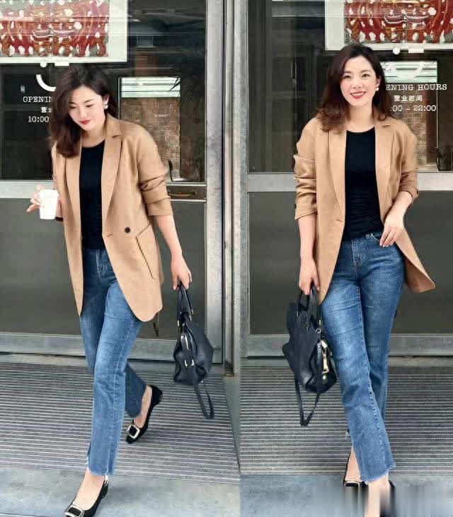 对于普通人来说,还是基础色小西装最受欢迎,如果想要突破过多的严肃感,可以尝试与牛仔裤搭配,更显随性气质。