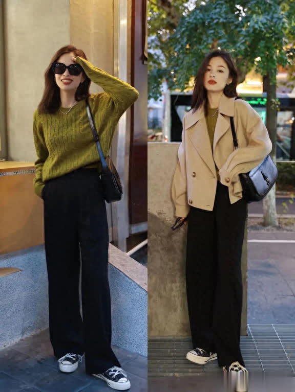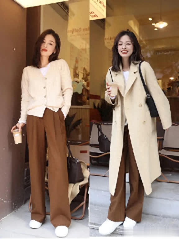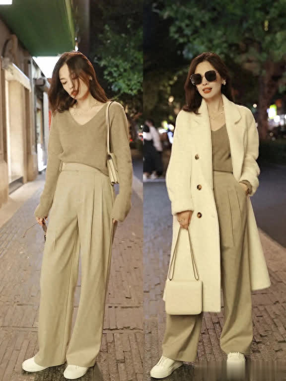 但有很多女生会觉得阔腿裤的搭配单调无趣,穿起来没什么亮点,所以我们可以选这种大地色系的阔腿裤,颜色上更独特,更时髦。