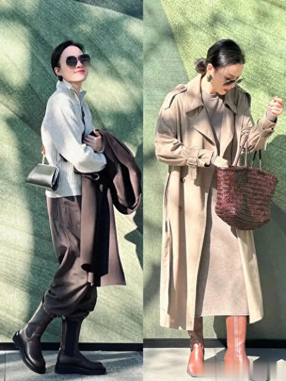 大地色系的服装很百搭,如果你不想穿得太花哨,可以先从基础色入手,比如黑色配大地色的风衣外套,这样叠穿就具有很好的层次感,深色内搭和大地色的外套相结合,简约有层次,也不繁琐。