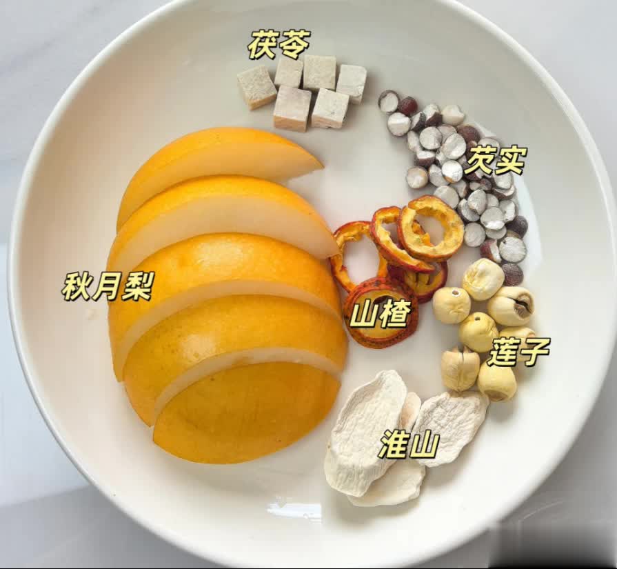 主料清单(4人份):秋月梨2个(约600克,选表皮泛黄、果柄发黑的,新鲜的秋月梨水分很足,让汤品很清甜,对嗓子有好处),排骨500克(前排肉嫩,带点肥的更香,煲汤前要焯烫处理),茯苓15克(药店有卖,选完整无碎块的),芡实20克(新鲜芡实更糯,干货要提前泡),干山楂片少许,淮山12克,清水和温水少许,食盐和胡椒粉少许,其他。