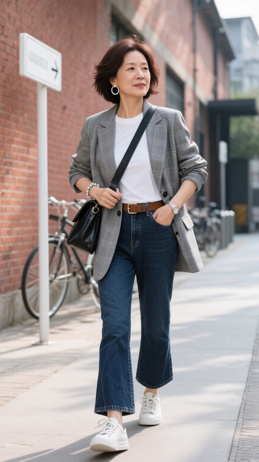 休闲时髦风:用一件灰色格纹西装搭配蓝色九分牛仔裤和白色T恤,再穿一双小白鞋或短靴,完美平衡正式与休闲感。