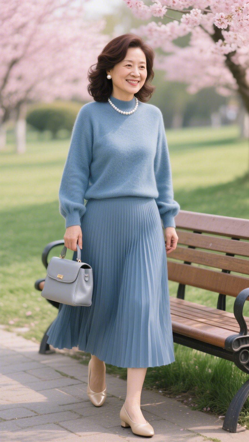 温柔优雅风:一件雾霾蓝色的针织衫,搭配一条同色系或灰色的百褶裙,配上珍珠配饰,非常显气质。