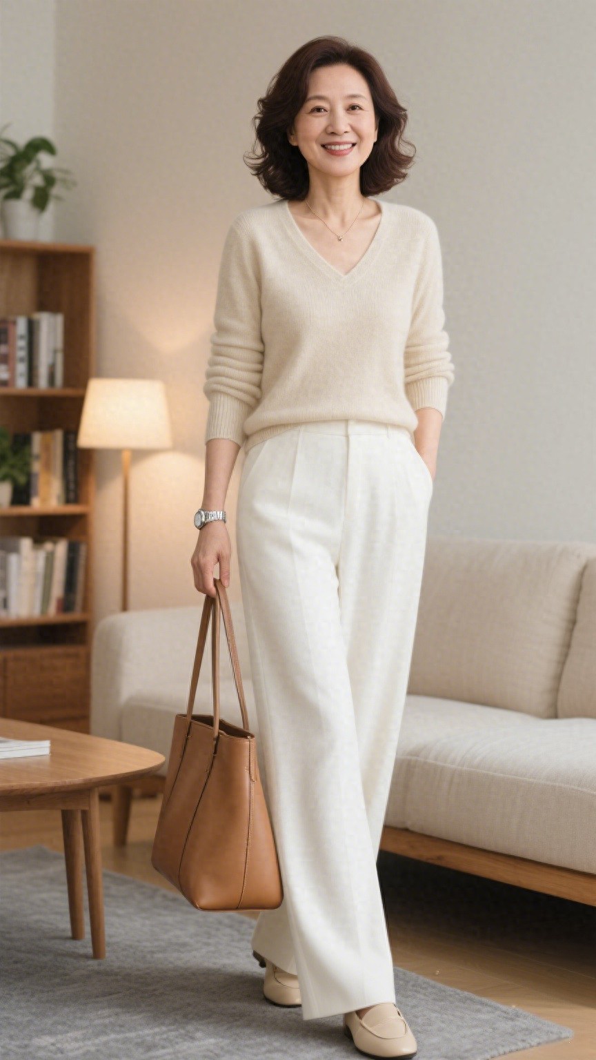 慵懒知性风:一件米色V领羊绒针织衫,搭配一条白色阔腿裤和乐福鞋,简约又高级。