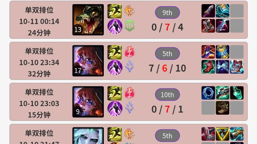 今年全球总决赛,是在本土举办,所以参赛选手们,最近都在峡谷之巅训练,BLG上单Bin,最近的排位战绩很“亮眼”,10号到11号,Bin哥一共打了10把排位,只赢了三局,其中一局阿罗拉,被路人完爆,玩鳄鱼的那一局,又遇到FNC上野,被对面无限针对,这两把Bin哥都被打成了0-7。