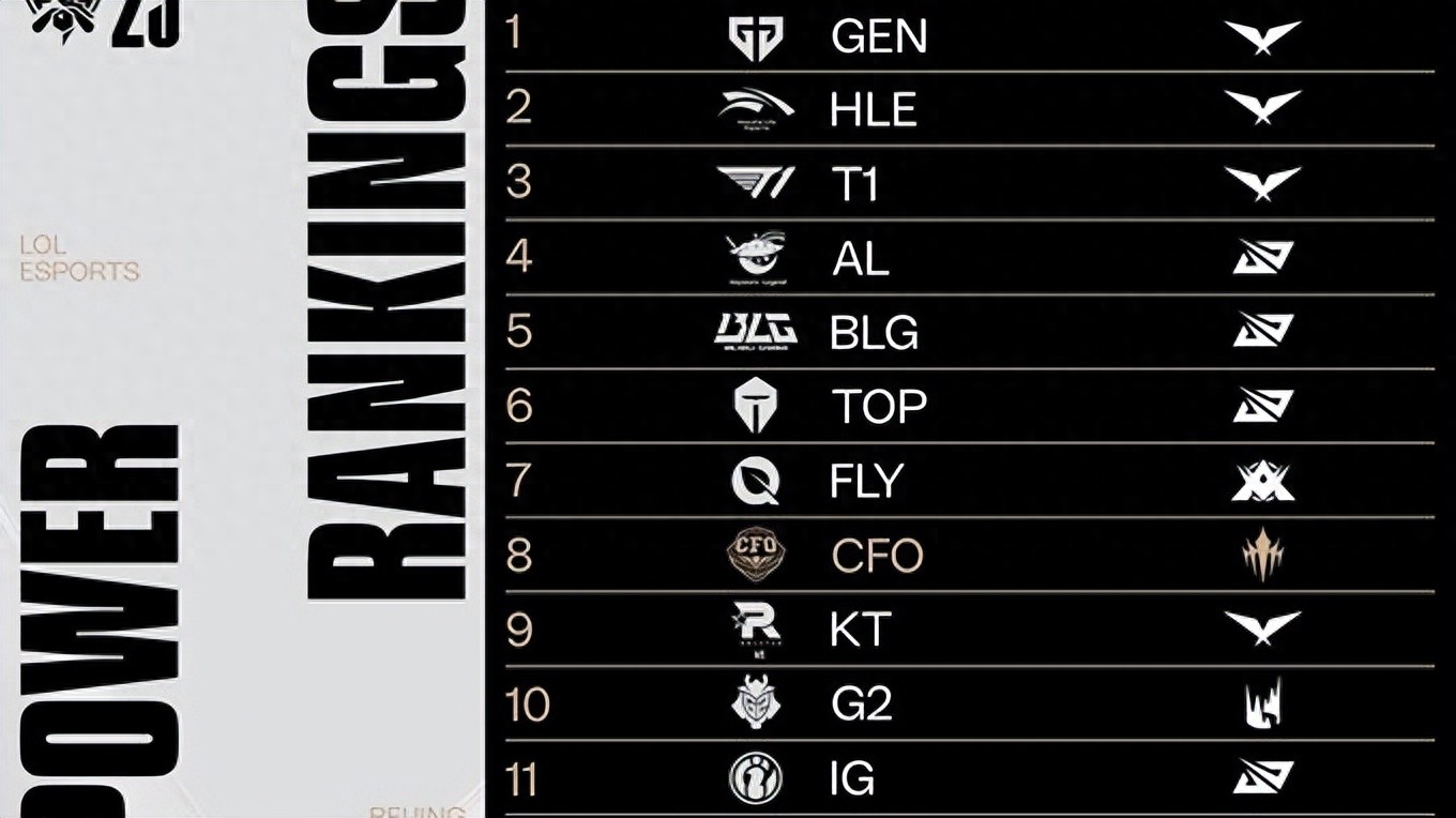 英雄联盟S15全球总决赛,再有2天就正式开赛了,LOL官方在近日,发布了17支队伍的战力排行榜,LCK的四支参赛队伍,全部位列前十,除了KT排名第九之外,剩下的三队包揽前三,而咱们是赛区,排名前十的有三支队伍,AL、BLG、滔搏,分别排在4-6名,IG则是跌出前10排第11。