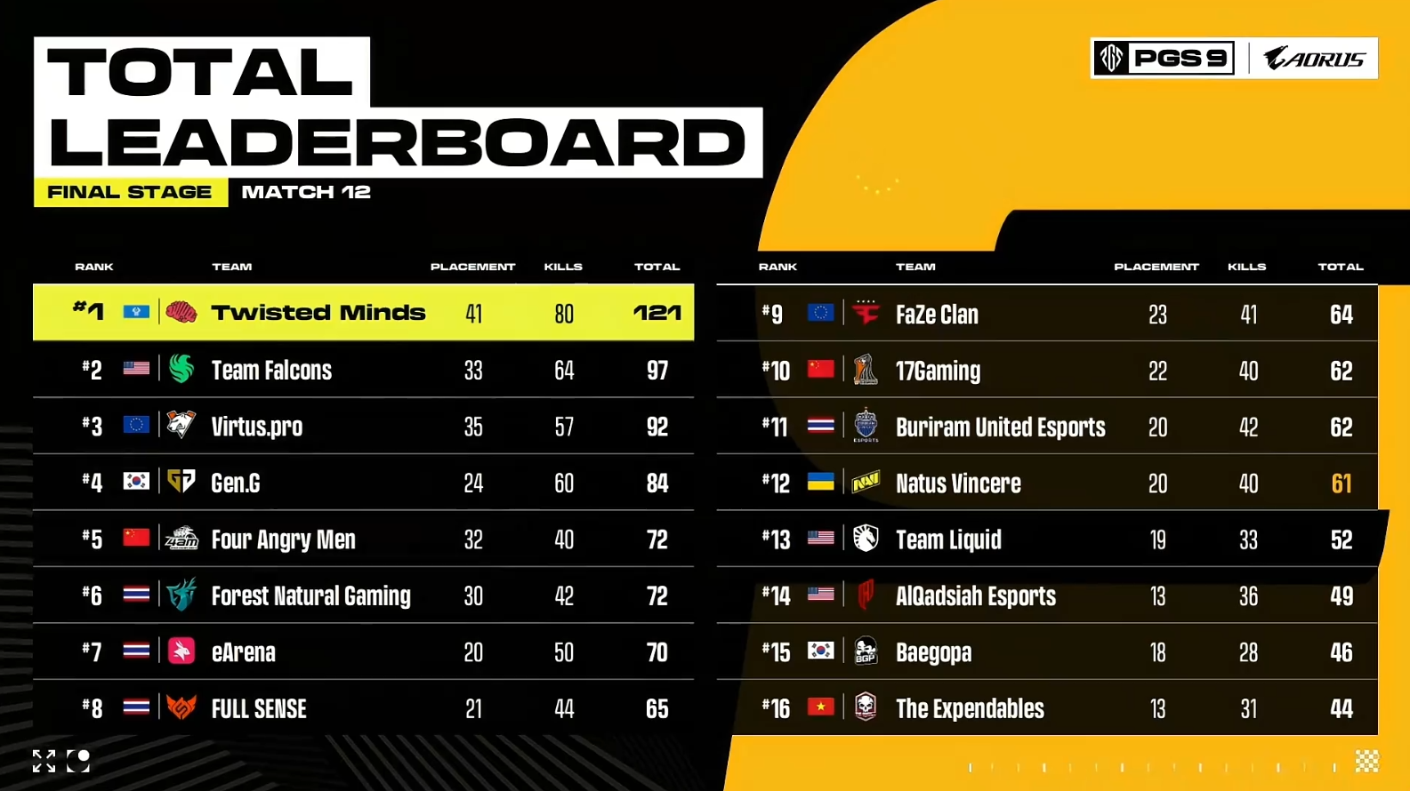 这轮比赛打完后PCL队伍已经失去了争冠的能力,TWIS以121分断层领跑积分榜,后面的FLC和VP只有90多分,84分的GEN位列第四,4AM与FOR同为72分。紧随其后的是70分的EA,把守第八大门的是65分的FS。17战队在吃鸡后从倒数第二来到第十名,谁能想到TE是这次比赛垫底的队伍,不知道最后一天他们还能不能翻回来。