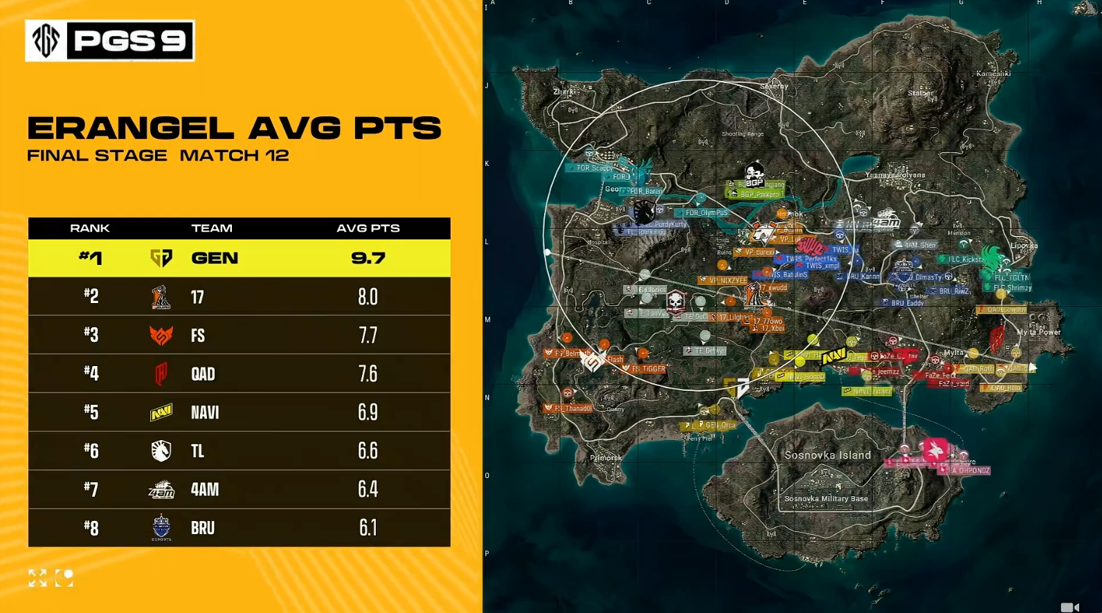 PGS9决赛第二天的比赛即将结束,目前TWIS成为了第一支总分破百的队伍,他还是这么猛,90分,80分和70分梯队的队伍都只有一支,分别是FLC,VP和GEN。4AM在刚刚那场天命决赛圈中找到了唯一不吃鸡的打法,圈收之前没有把防守重心放在身后,给了VP可趁之机硬是被换掉3人,仅剩的小鹿无法面对马路另外一侧的FOR,如果放以前不知道能喷多久,但现在,反倒是该怪我们期望值太高,这才是他们的正常水平。
