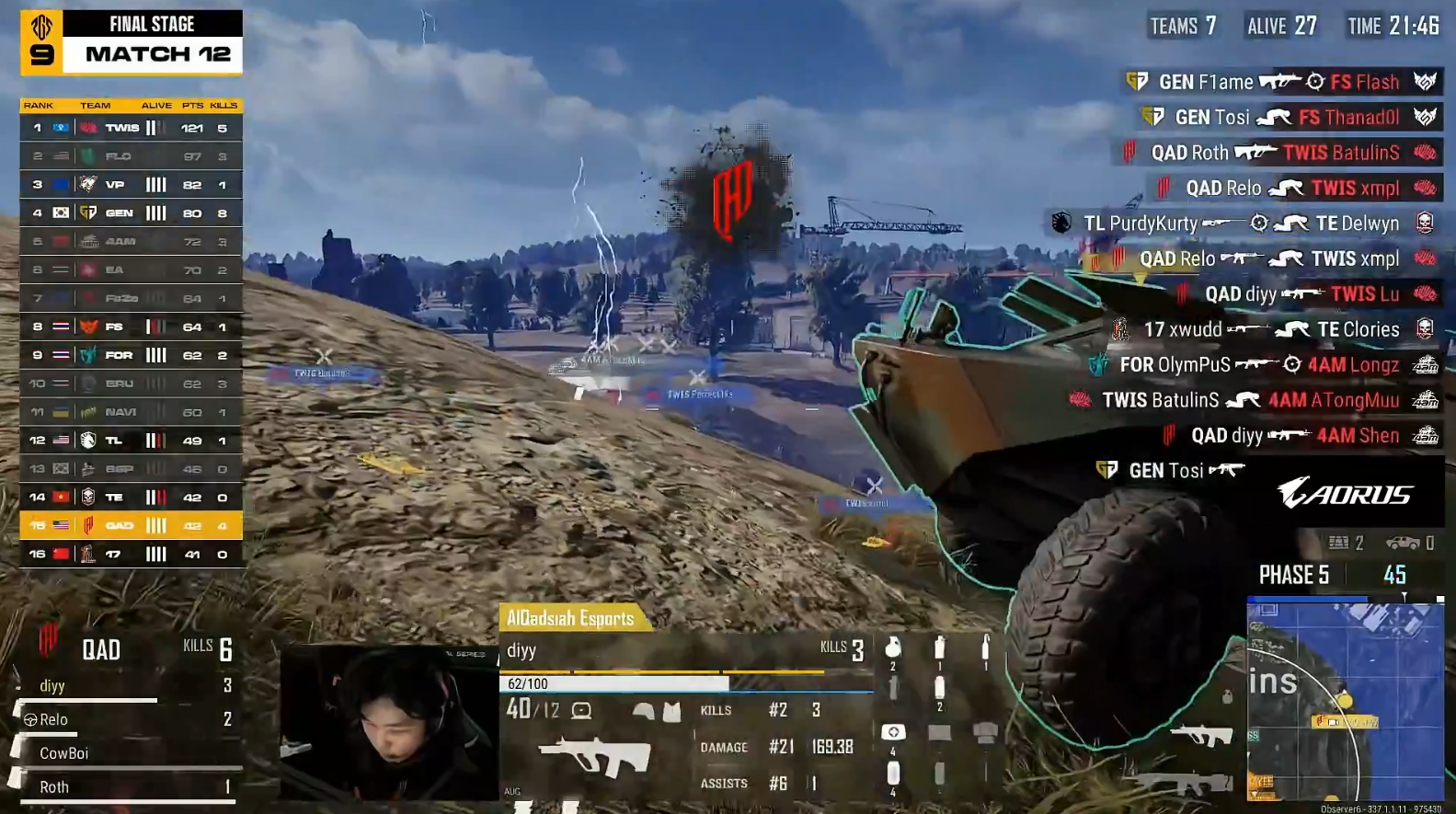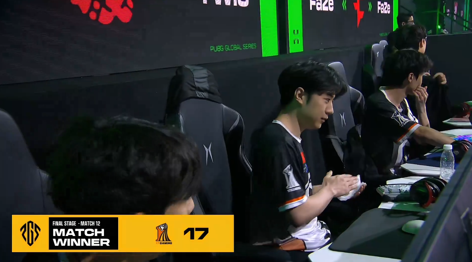 阶段7圈形刷新,FOR和QAD都贴到了VP的房区反坡,17位于弱侧但位置很低,被TL的独狼和GEN一直骚扰,蓝圈收缩后GEN一波冲锋送到QAD脸上,独狼清掉后17成为了左侧的唯一队伍。8圈出现后FOR无伤清掉QAD,17趁VP收缩时抢到靠近圈中心的两间房,FOR好像打嗨了,没管VP选择用C4爆17,还好这个C4效果不好,反倒是VP出手配合17先把FOR打了,后续17利用房顶优势稳扎稳打拿下VP成功吃鸡。