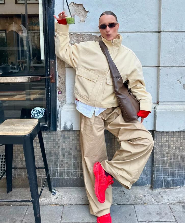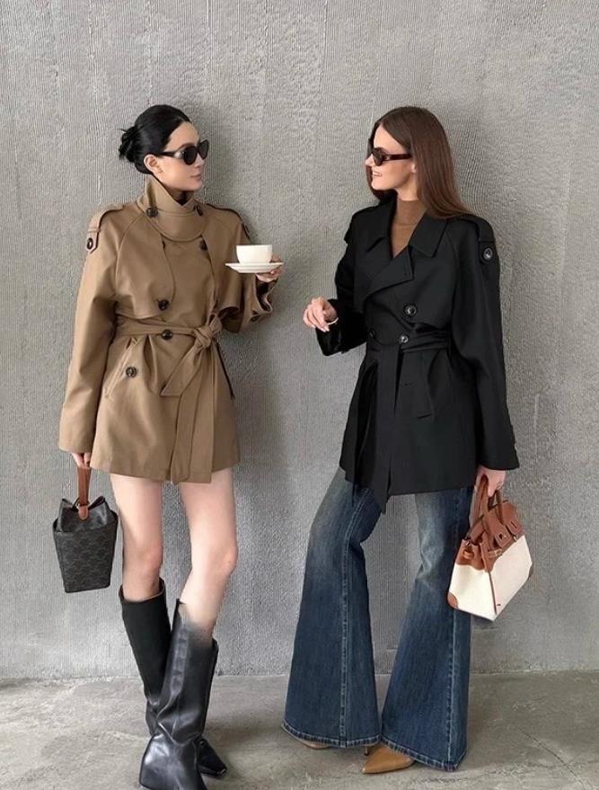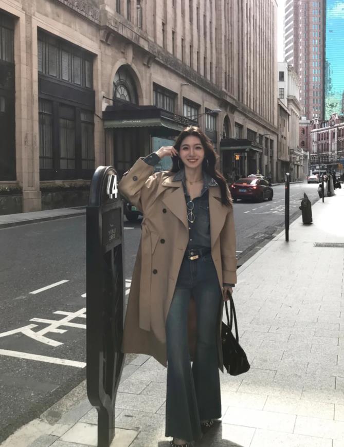 风衣作为每年秋冬季的衣橱必备,又怎会不流行呢?特别是这种经典的卡其色,穿起来也太大气了,内搭牛仔衬衫和同色的喇叭裤,很复古显利落,腰间金色腰带进行点缀,不仅修饰身材还提升了腰线,搭配黑色手提包,简约中又透着几分精致,有种优雅摩登范。