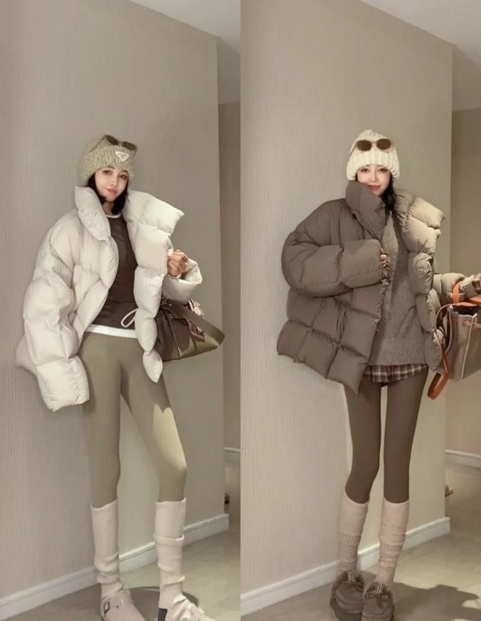 今年冬天会很冷,所以,羽绒服一定要安排起来,像这种空气羽绒服就是今年流行的款式,轻盈舒适又保暖,不喜欢长款的,可以试试短款,利用上松下紧的搭配原则,就可以在视觉上实现显瘦的效果,利用堆堆袜点缀,很好丰富了整个穿搭。