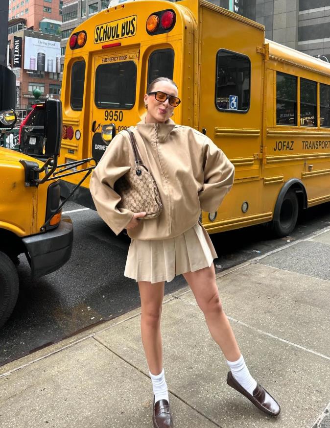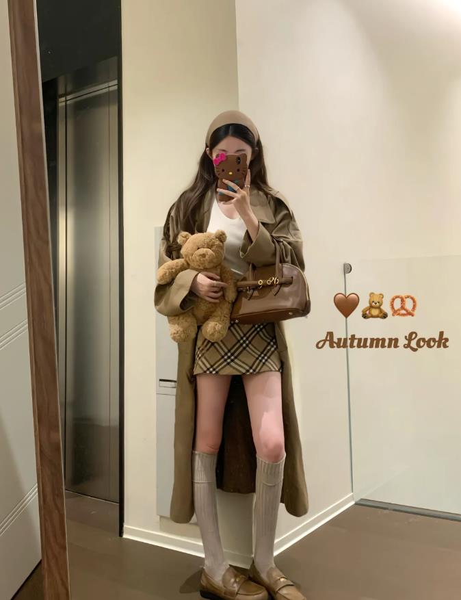 很喜欢这种带点甜酷感的穿搭,卡其色长款风衣,就这么敞开来穿,营造出随性大气范,内搭白色上衣,下身是一条格纹短裙,露出腿部线条,视觉上很显高挑,搭配浅灰色长袜和棕色乐福鞋,复古又充满和谐,手里提着棕色包包,秋日氛围感直接拉满。