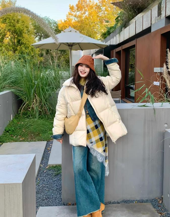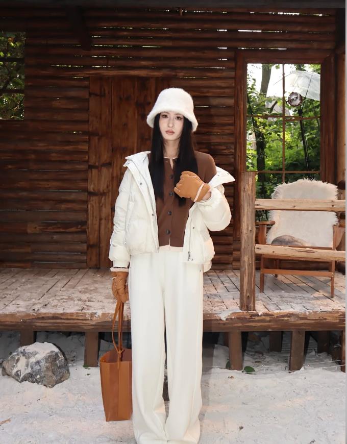 这一套穿搭满满的氛围感,白色短款羽绒服,穿起来很不失利落感,显高挑的同时又不会看起来很臃肿,内搭棕色开衫,下面是一条白色阔腿裤,整个配色很和谐温柔,手里棕色的包包,增添了复古气息。