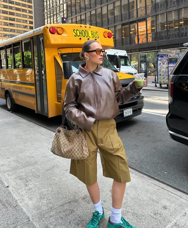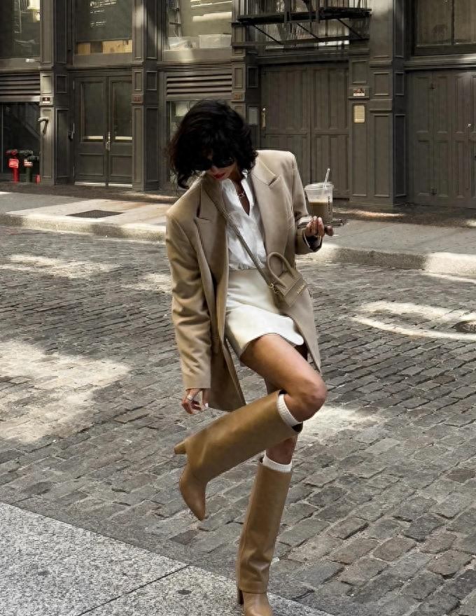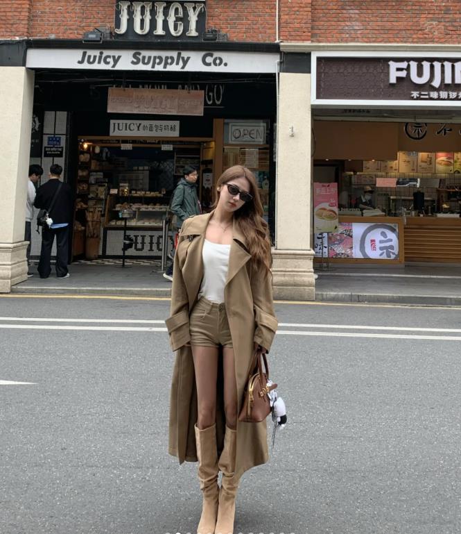 这一套穿搭走的是轻熟飒爽风格,卡其色的长款风衣,真的是每年秋冬都会流行呢,内搭白色吊带,下身配的是一条与风衣颜色一致的短裤,就这么露出大部分腿部线条,结合长靴来穿,瞬间就把腿部线条给拉长了,再加上墨镜的加持,自在洒脱还不失魅力。