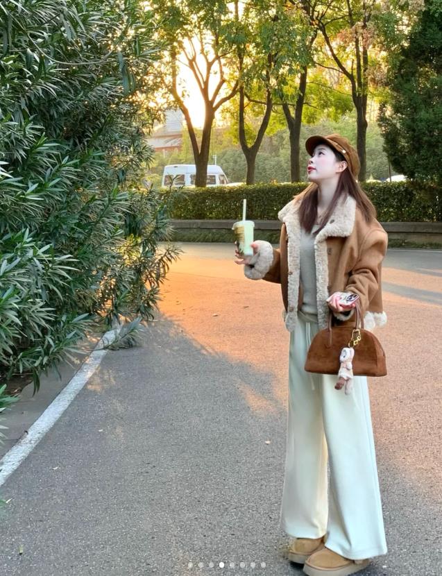皮毛一体的外套也是今年秋冬很流行的款式,棕色的皮毛一体外套,是比较短的款式,毛绒领和袖口增添了暖和感,内搭浅灰上衣和白色阔腿裤,营造出上短下长的效果,小个子这么穿就是很合适,脚上踩着的浅棕厚底鞋,整个配色很和谐,保暖又带着几分随性。