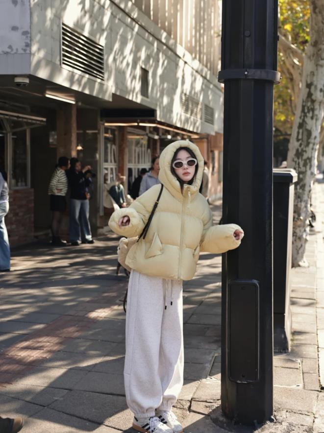 充满休闲活力风的搭配,喜欢这种随性休闲装扮的穿搭,可以借鉴起来,鹅黄色的空气羽绒服,这个色调实在是太衬肤色了,利落的短款,更是穿的利落和显高,下面搭配浅灰色束脚卫裤,宽松舒适,再加上一双白色休闲鞋,简单又舒适。