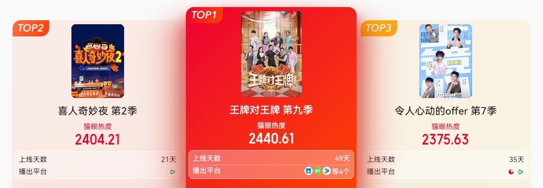 从播放数据来看,目前热度最高的是《王牌对王牌9》、《喜人奇妙夜2》以及《令人心动的offer 7》。